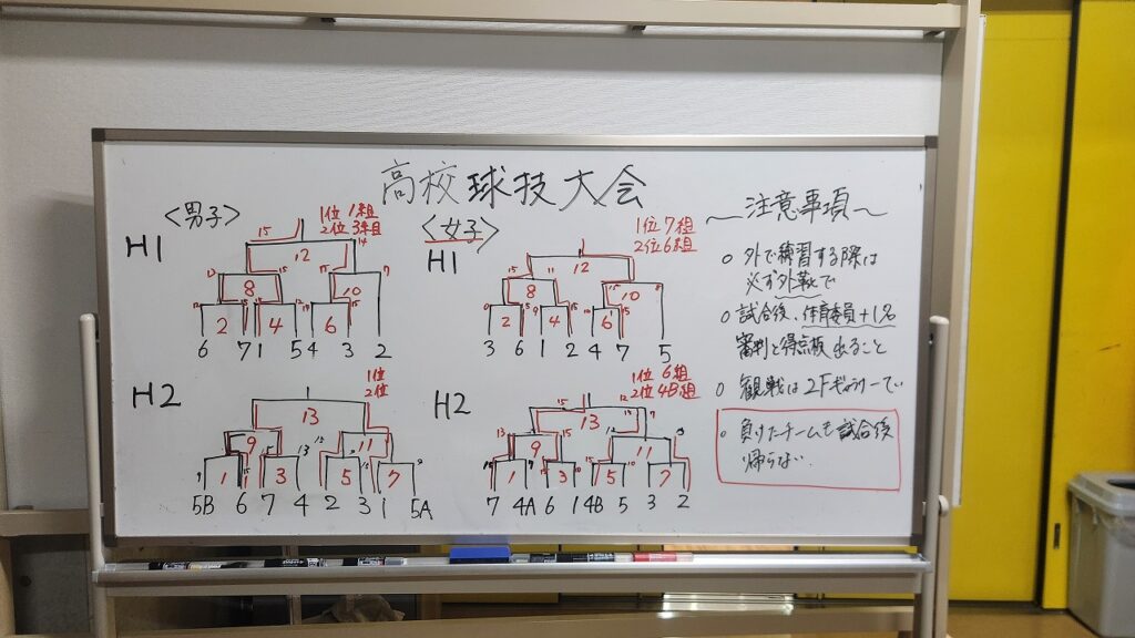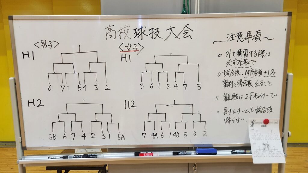 諸注意の後、高校体育委員会 委員長からの挨拶。その後準備運動をします。 下図は、今大会の組み合わせです。