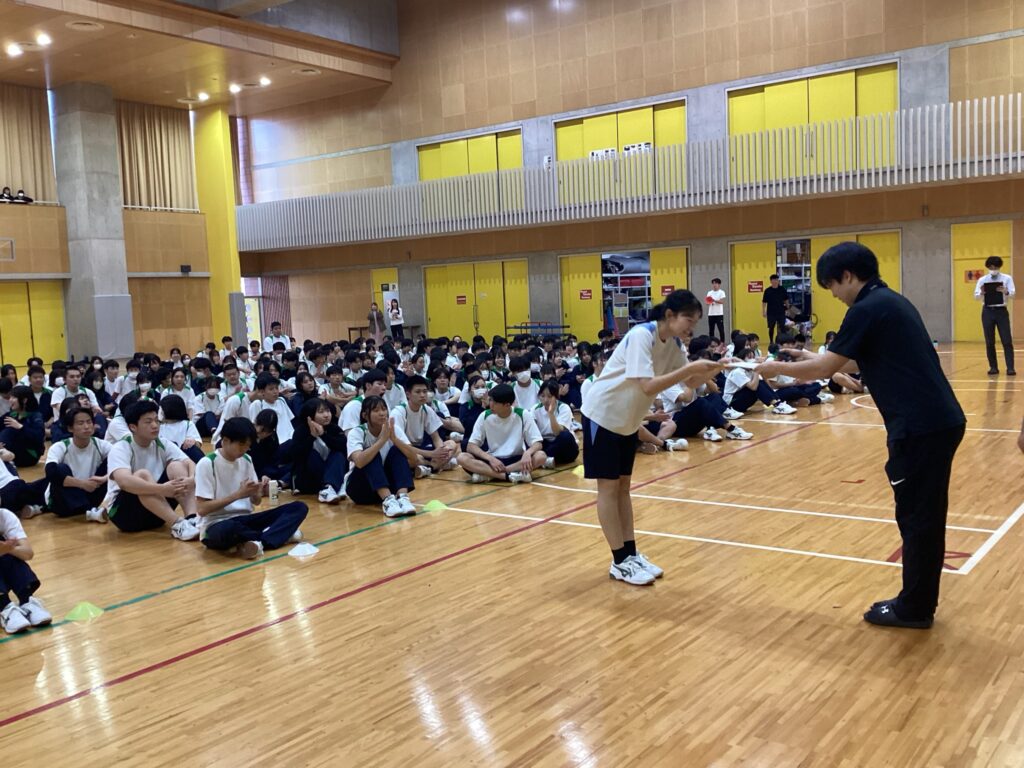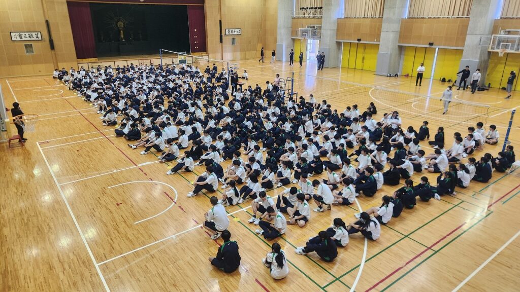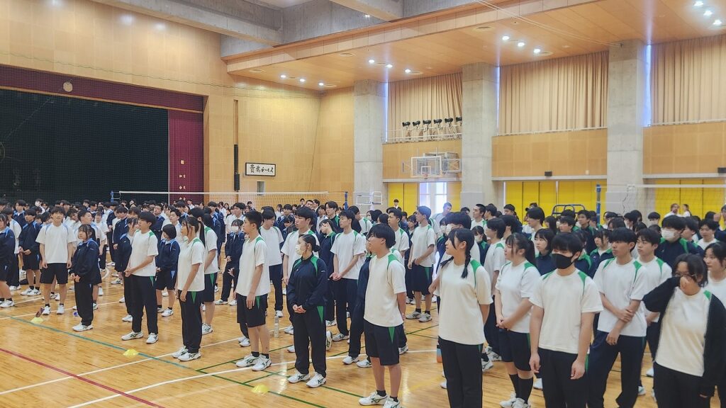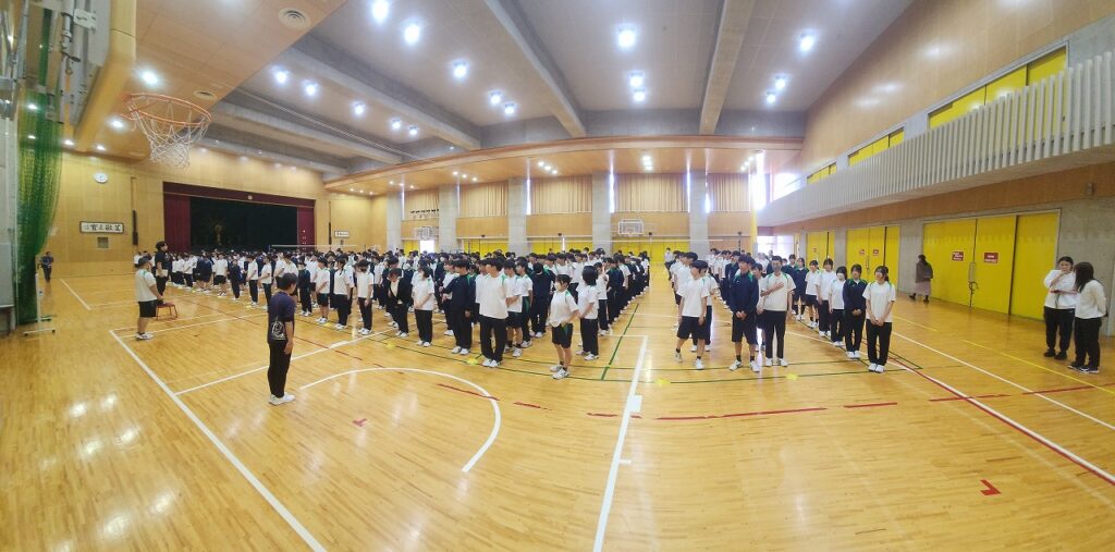 開会式で体育館に集合した高校1年生7クラスと高校2年生7クラスです。