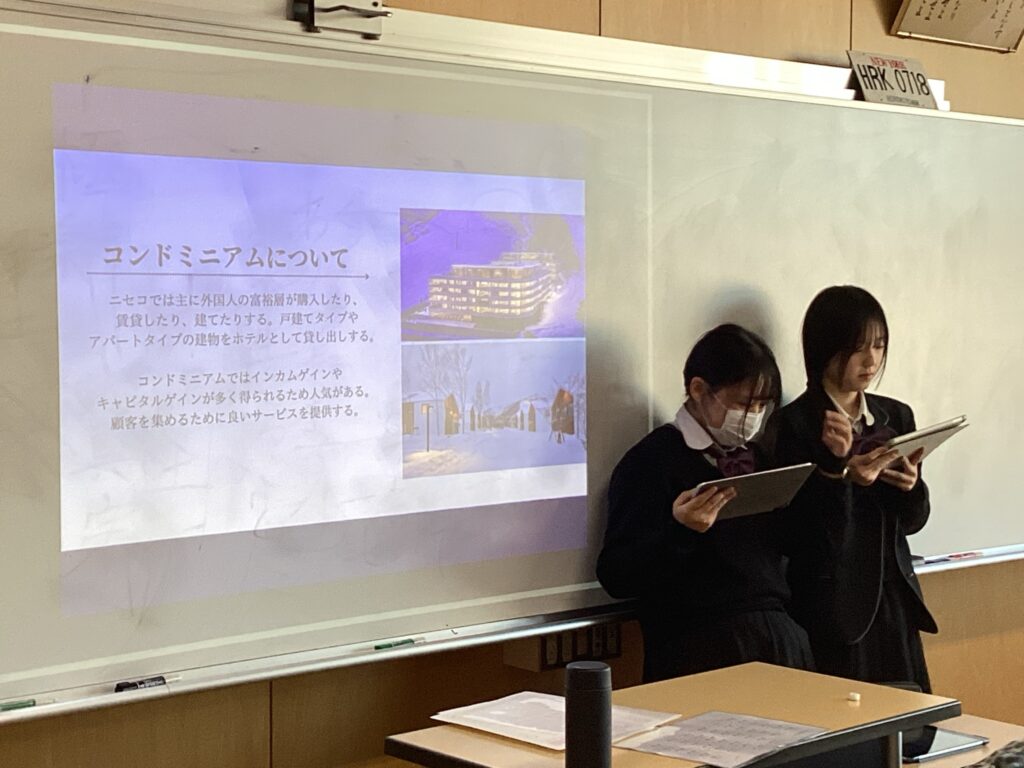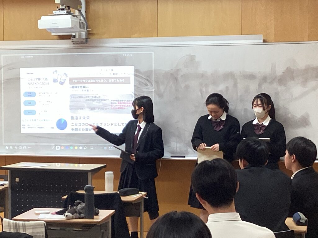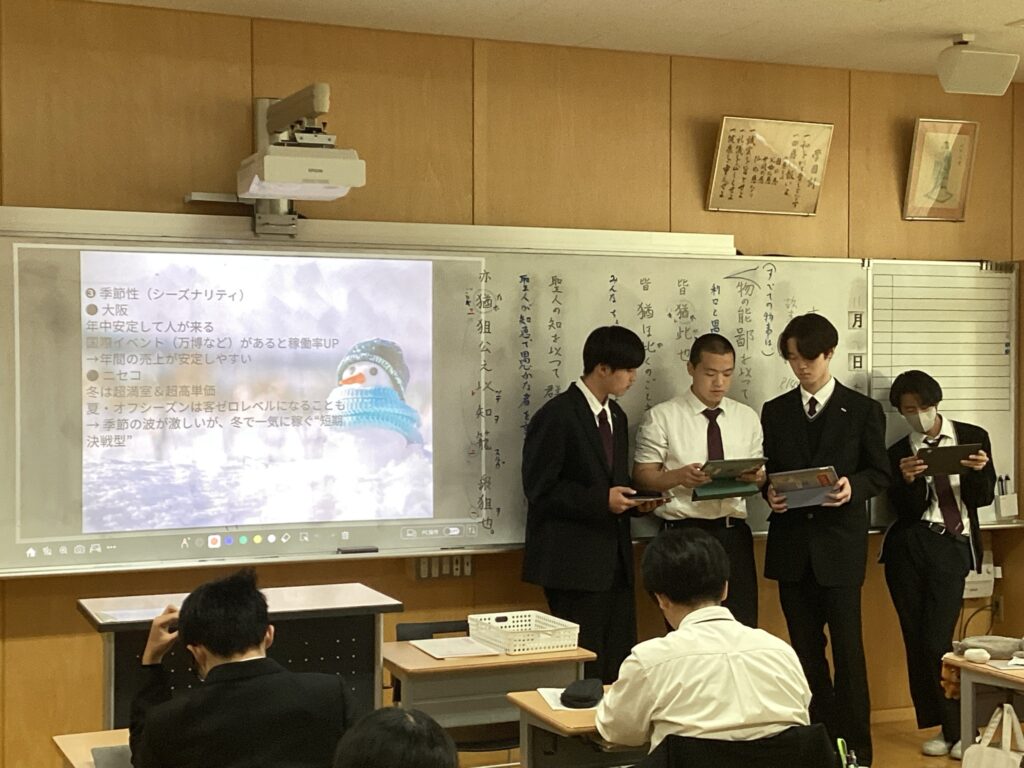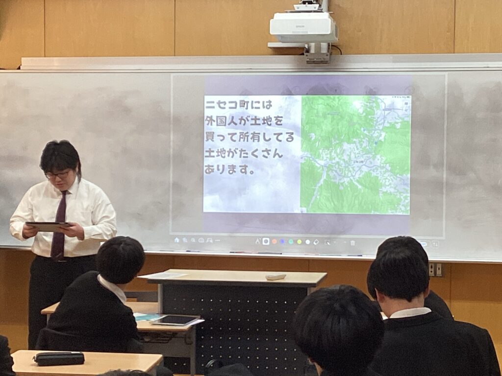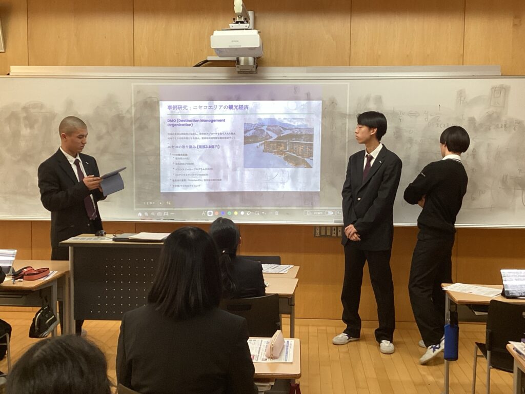 修学旅行で訪れたニセコの地域経済の講演や事業所訪問をベースにして、大阪において「どのように外国人と共生していくか」というテーマで各グループの発表が行われました。