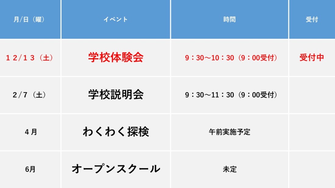 本イベントは本校入試の説明及び、年長・年中のお子様に入試体験をしていただくものです。