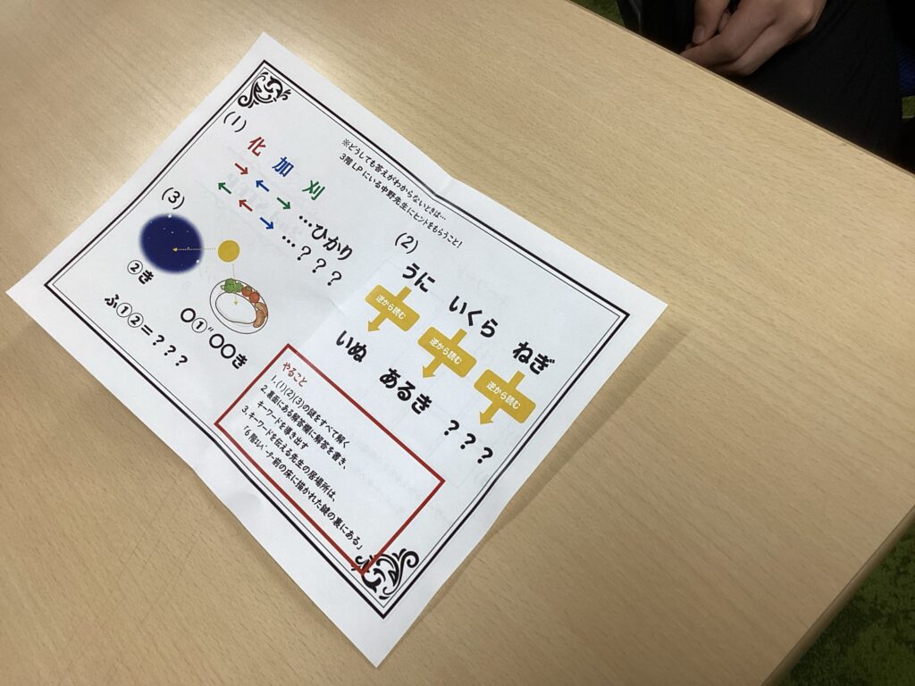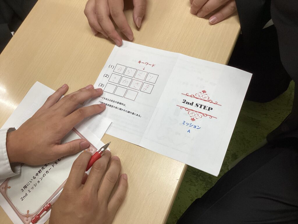第1弾のテーマは「謎解き脱出ゲーム」です!広い校舎の場所を覚えることも兼ねて、校内のあらゆる場所を巡り、脱出ゲームに挑戦しました!生徒はとても楽しそうにクラスの友達と意見を出し合いながら取り組んでいるのが印象的でした。