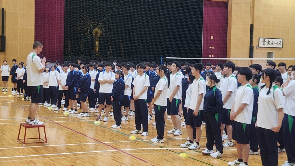 開会式で体育館に集合した高校1年生7クラスと高校2年生7クラスです。
