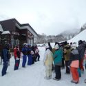 関温泉スキー学校前に班別に集合し、ご挨拶をした後関温泉スキー場でスキー、スノーボードを楽しまれている方々の安全と、本校スキー学舎が成功裏に終わることを祈念して、般若心経を読誦しました。その後スキー学校の布施徹様よりご挨拶をいただきました。
