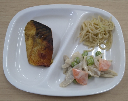 「さばのカレー風味焼き」は、濃口醬油・酒・みりん・カレー粉を混ぜ、さばに和えてからオーブンで焼き上げています。