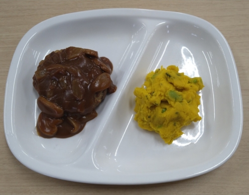 「パンプキンサラダ」は、かぼちゃと枝豆を使用し、ノンエッグマヨネーズ・塩・こしょうで味付けされています。