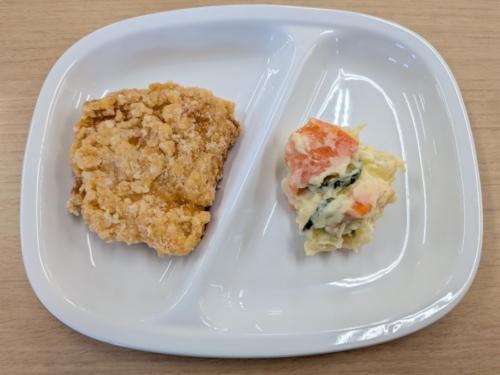 「野菜スープ」には、「玉ねぎ・人参・しめじ」の3種類の野菜を使用しています。味は、「コンソメ・薄口しょうゆ・塩・こしょう」でつけています。