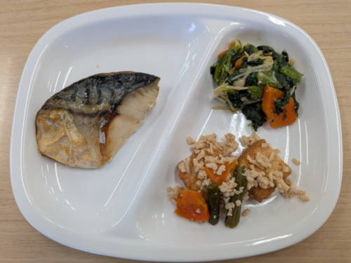 「厚揚げのそぼろ煮」は、「そぼろ」に鶏ひき肉を使っています。他の具材は、厚揚げ・人参・いんげん豆の3種類を使っています。