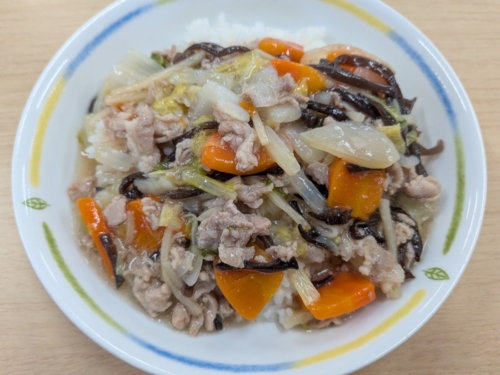 「中華丼」は、豚肉・白菜・玉ねぎ・人参・たけのこ・きくらげの6種類の具材を使用しています。具沢山の丼に仕上げられています。