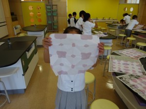 模様を作って楽しみました。紫の花を搾った液に酢を加えると赤色に変色していました。どうしてかな?