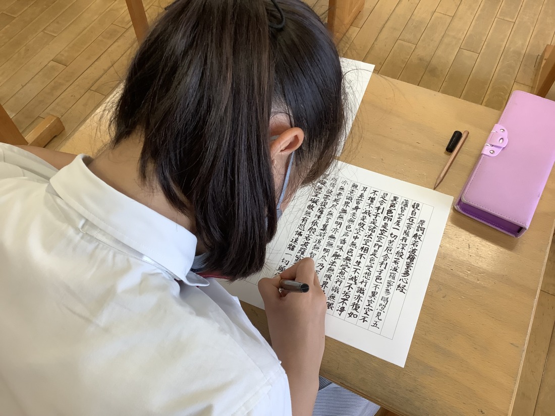 まずは、写経観念文をみんなで唱えました。その後、昨日の仏教校外学習で学んだことをしっかりと思い出しながら一文字一文字ていねいに、心を落ち着かせて取り組む姿が見られました。みんなの願いが届きますように。