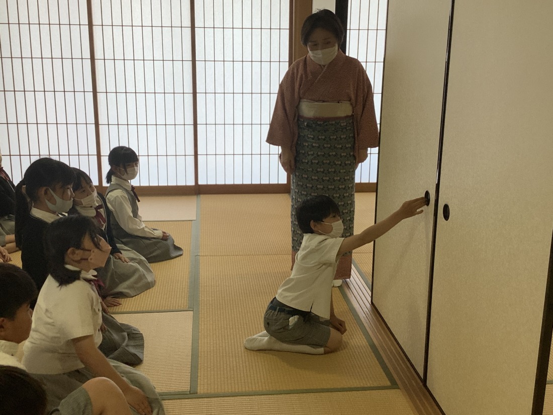 ふすまの開け方や畳上でのあいさつの仕方、歩き方を学んで、一人ずつ練習しました。