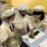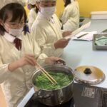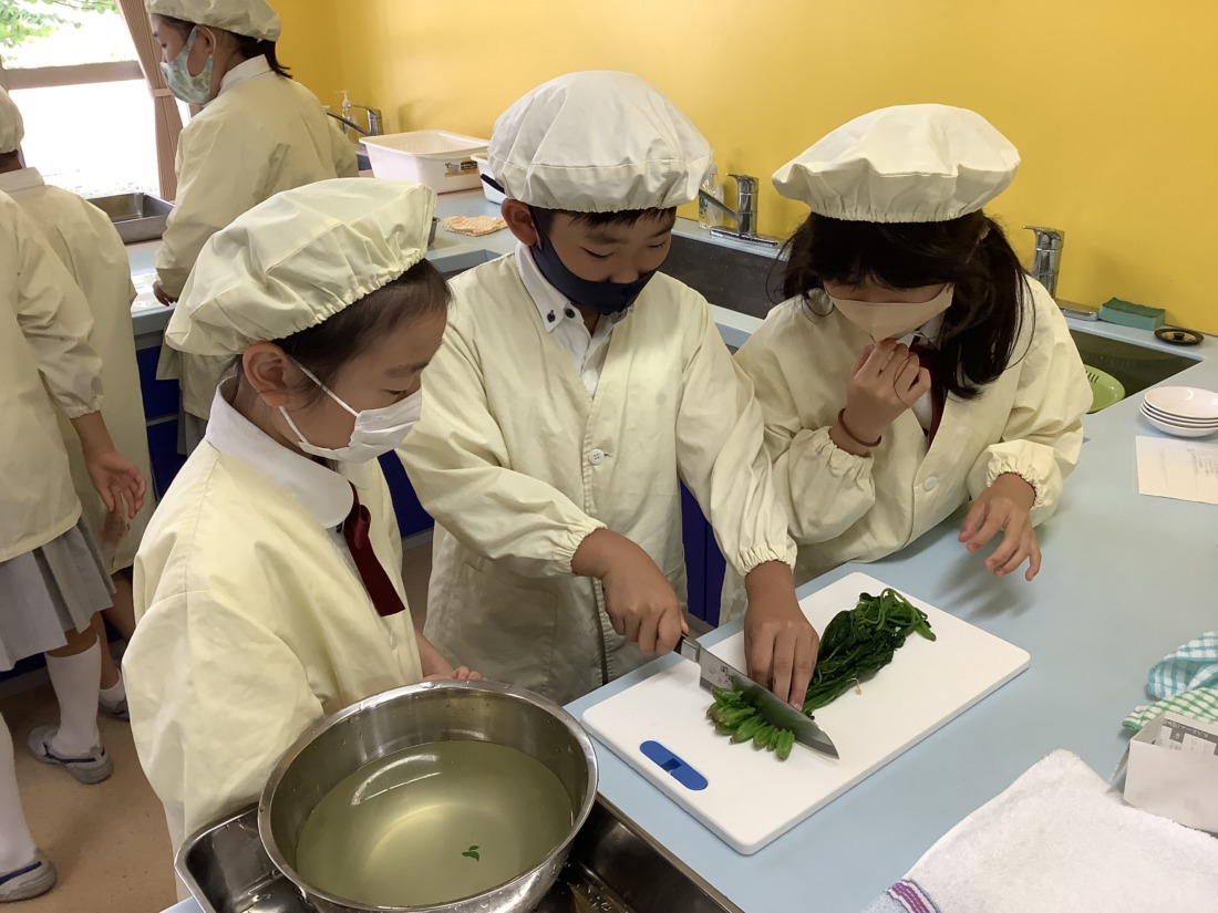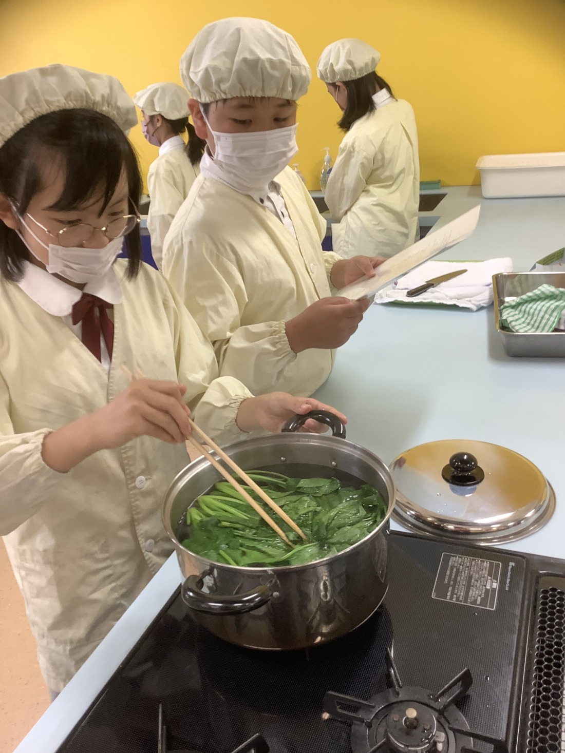 家庭科の学習で、調理実習をしました。今回のめあては「青菜をゆでたときの変化を確かめよう。包丁を安全に使おう。」でした。どの班も協力して、テキパキと準備したり片付けたりすることができました。自分たちでゆでたほうれん草はいつも以上においしかったようです。ぜひおうちでも青菜をゆでてみてほしいと思います。