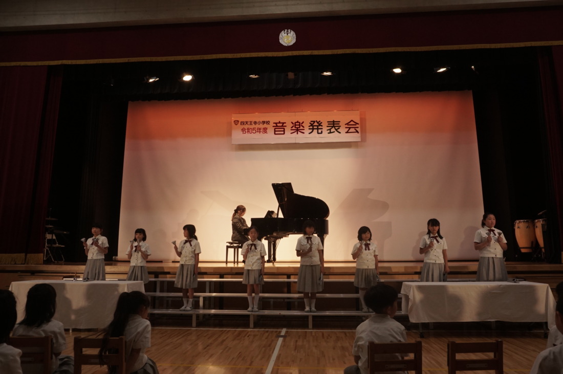 6年生は、器楽合奏と合唱を発表しました。最後の音楽発表会なので、みんなで聴き合ってよくそろえた演奏をしようと、頑張りました。器楽合奏では、指揮者をよく見て、他の楽器の音も聴きながら、息の合った合奏を披露しました。合唱でも、ソプラノとアルトがそれぞれのパートの役割を考えながら声を合わせ、美しい二部合唱を奏でることができました。