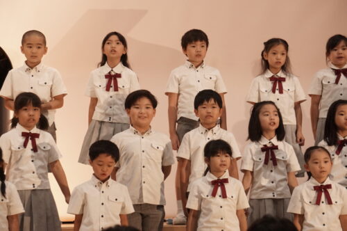 プログラムの最初には「音楽のおくりもの」を、最後には「学園歌」を全校児童で合唱し、体育館中に歌声が響き渡りました。