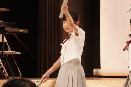 音楽クラブは、ハンドベル(ミュージックベル)とトーンチャイムで「ドレミのうた」を演奏しました。美しい音色が体育館中に響いていました。