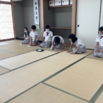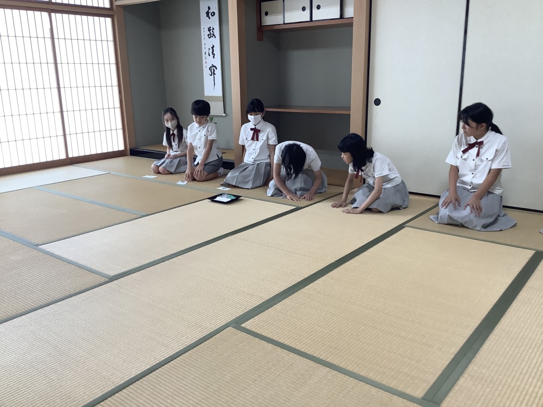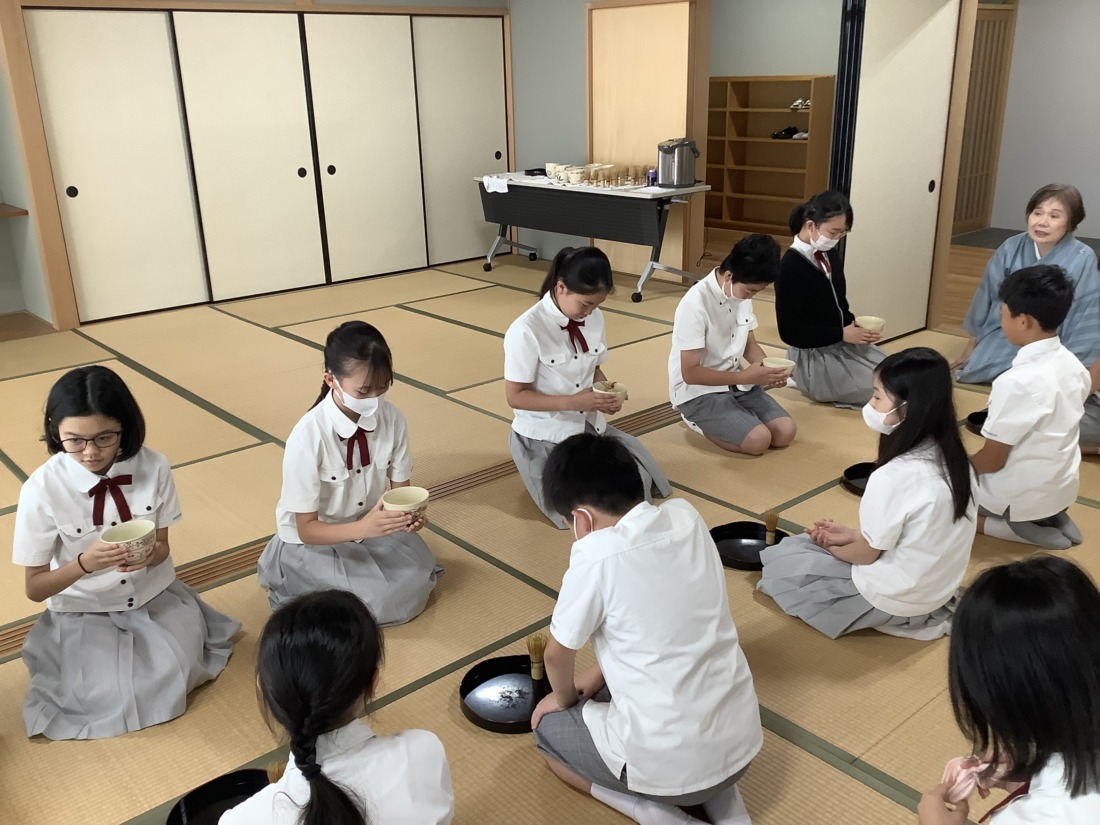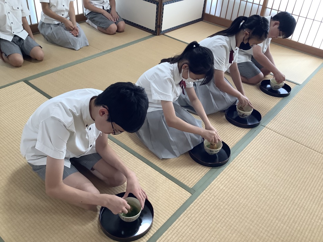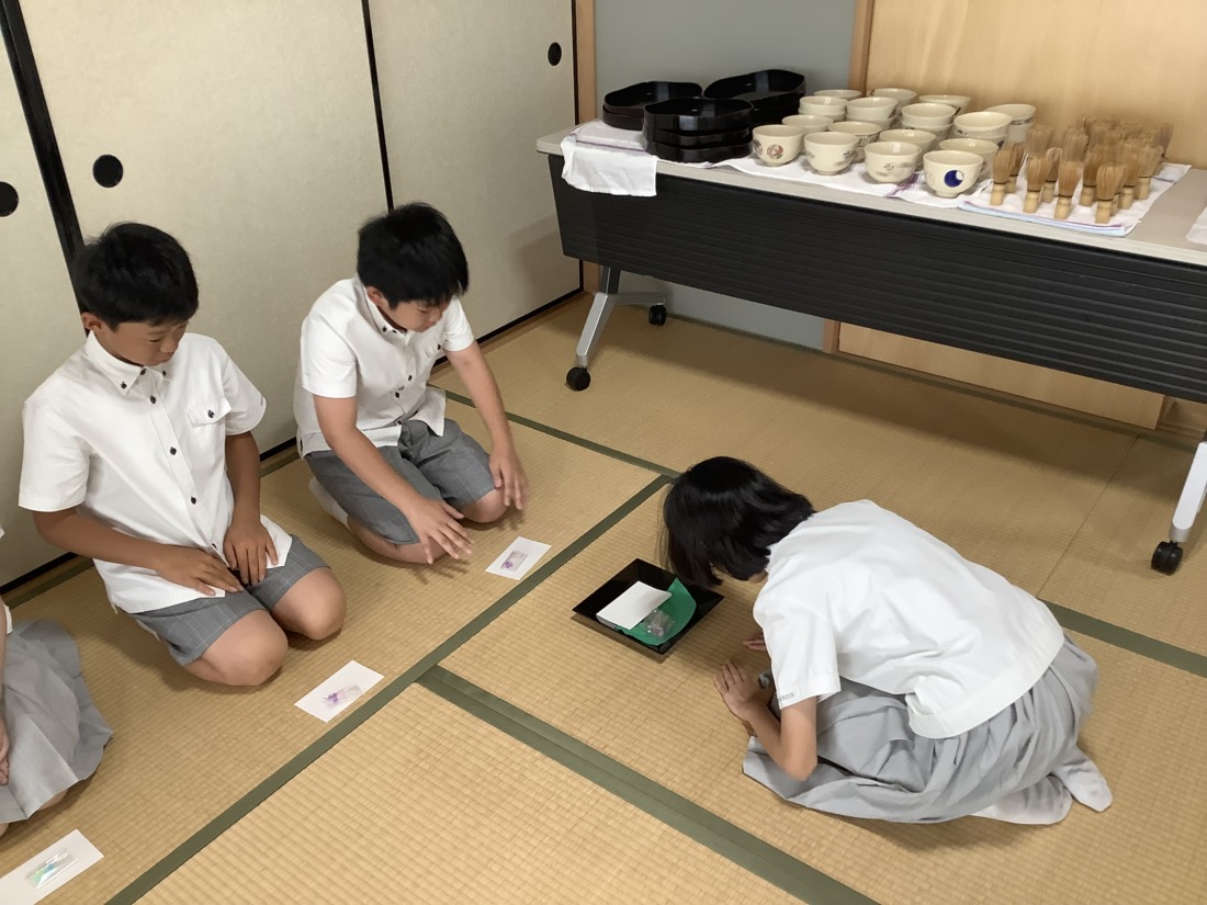 また、お茶を点てる際には、茶筅を垂直に立て、穂先を常に碗の底に軽く当てた状態で前後に動かします。茶筅を回したり小刻みに振ったりするのではなく、碗いっぱいを使ってしっかりと縦方向に動かしていました。さすが6年生。落ち着いた態度で学習に取り組み、お茶の点て方も上手になり、きめ細かく泡立てることができるようになっています。先生にも褒めていただきました。