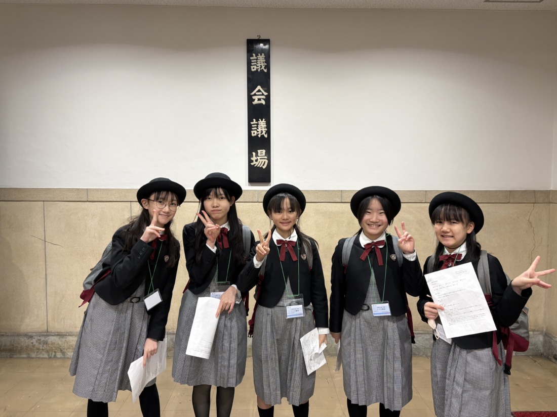 6年生は社会科見学で大阪府議会へ行きました。ここでは、まず「キッズ府議会」と題し、議会体験をさせていただきました。子どもたちは、実際に議員の方が使用している議席に座らせていただき、とても嬉しそうな顔をしていました。キッズ府議会では、子どもたちが将来こうなればいいなという議題を考え、代表児童が議長や議員、知事、副知事、教育長を担当し、実際の議員の方と同じように議会をしました。代表児童は、これまでに練習を積み重ね、緊張しながらも堂々とした態度で取り組みました。