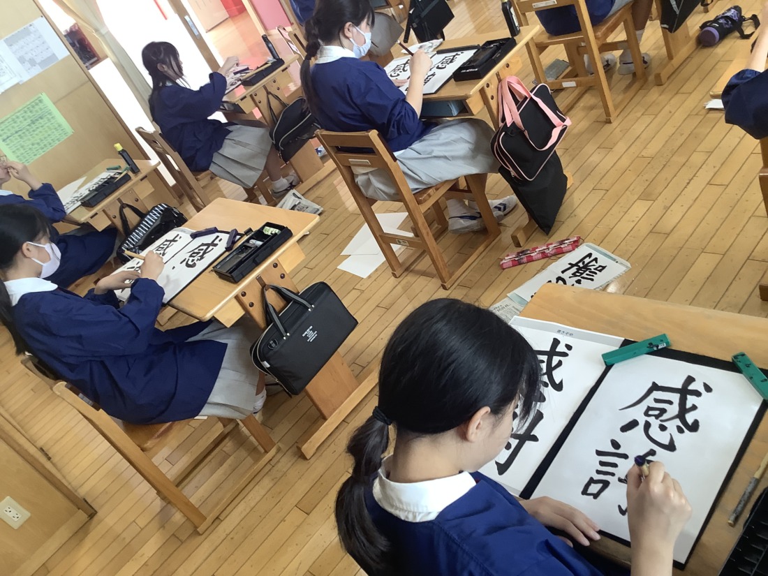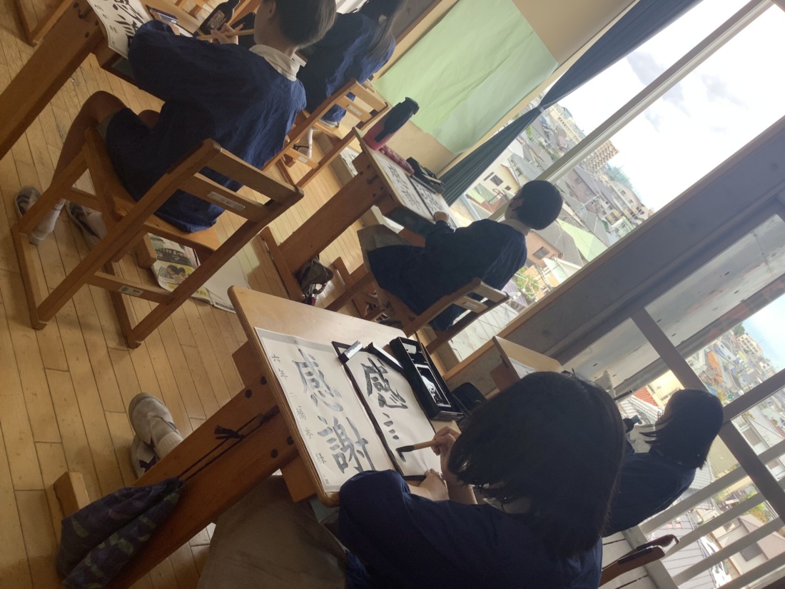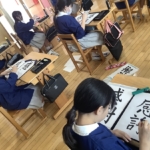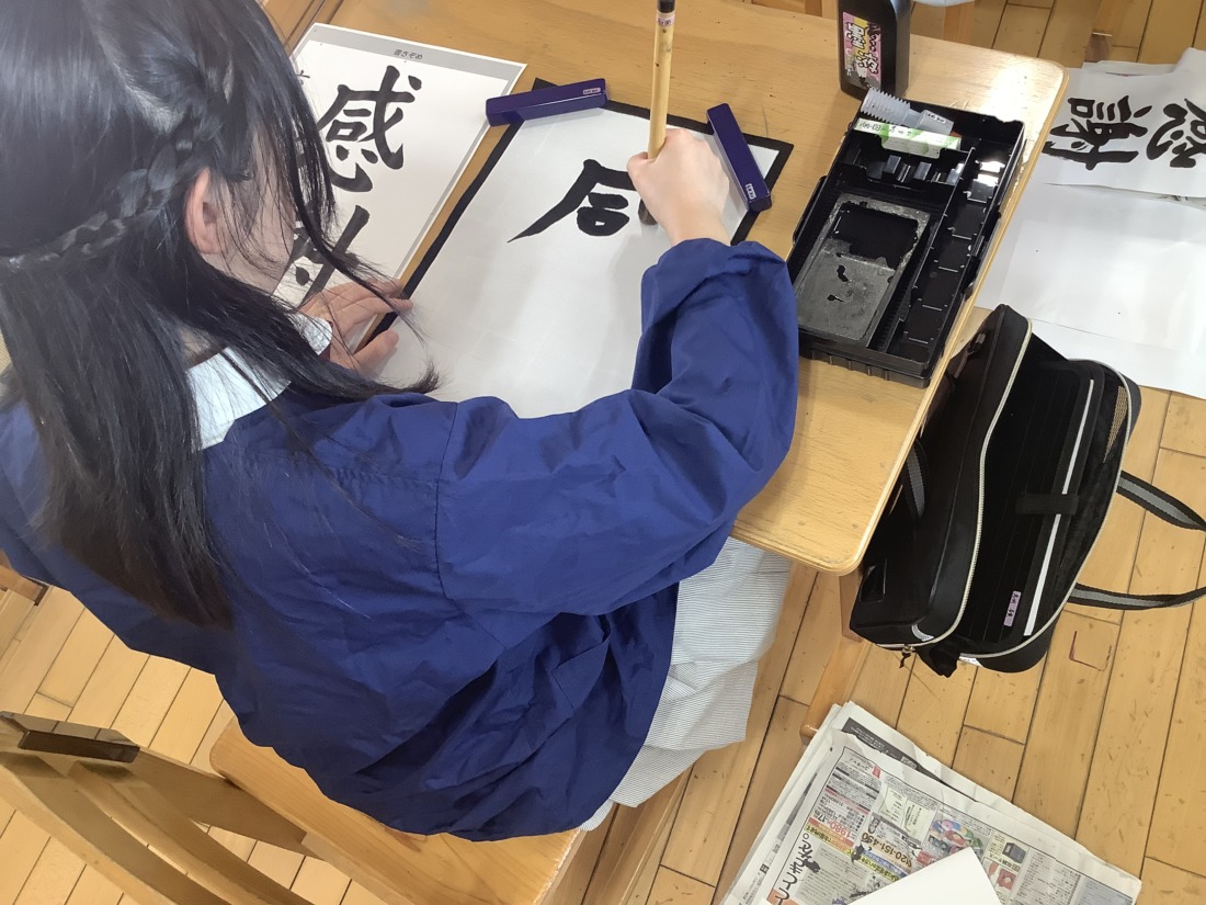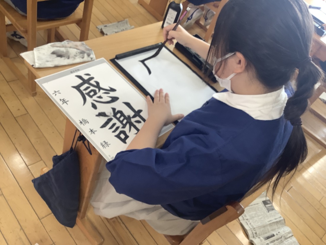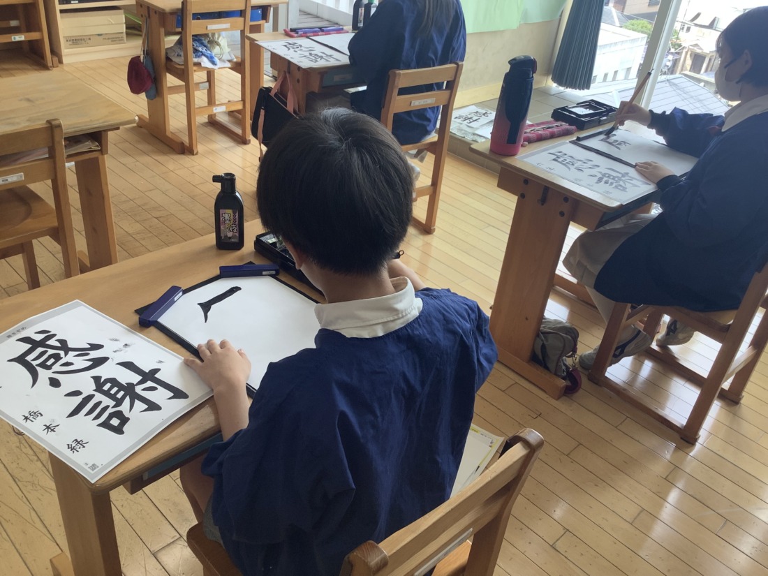 心落ち着かせて、「感謝」をかきました。画数が多く難しかったのですが、字のバランスに気をつけながら、お手本の「止め、はね、はらい」をしっかり見ながら書きます。これまで習ってきた始筆、終筆も上手にできていました。
