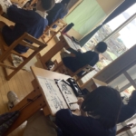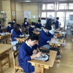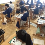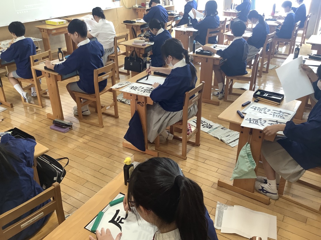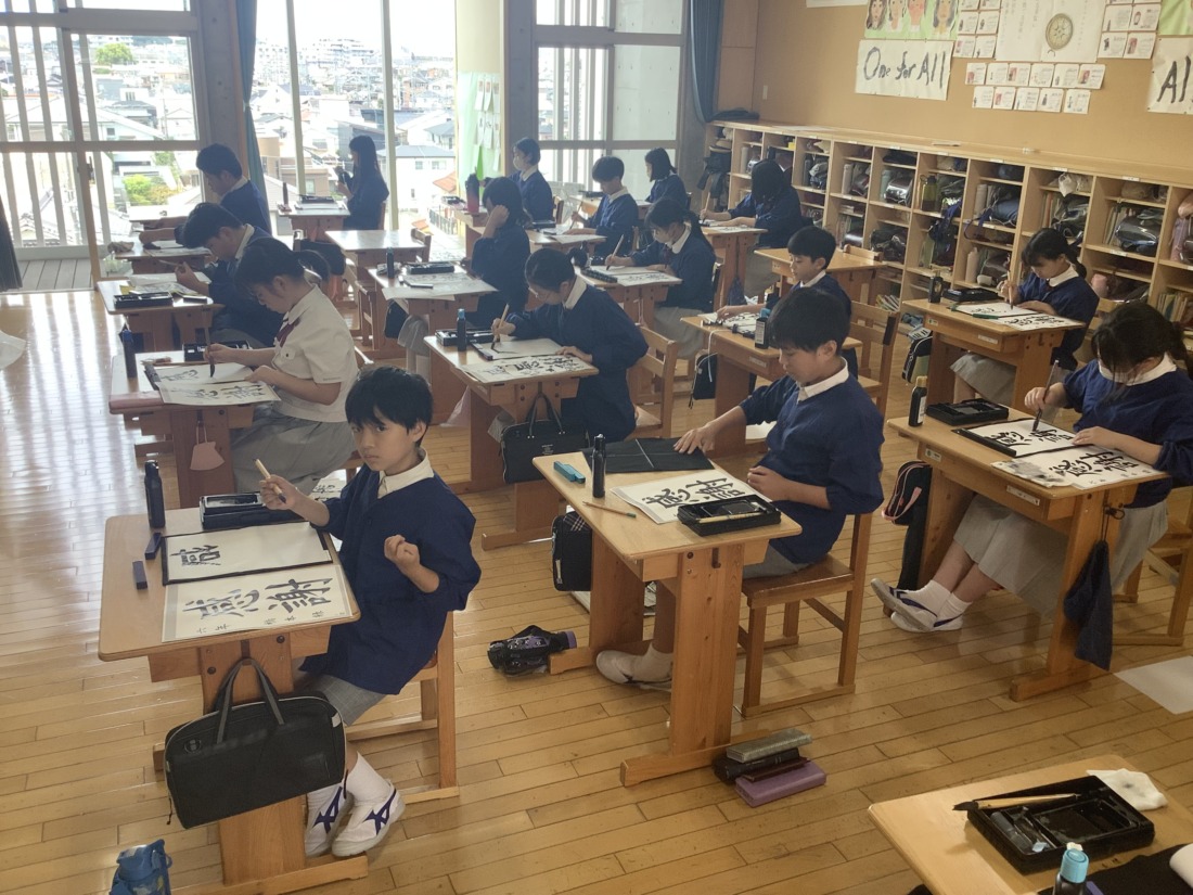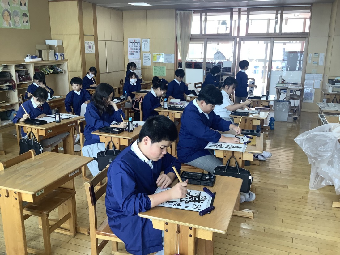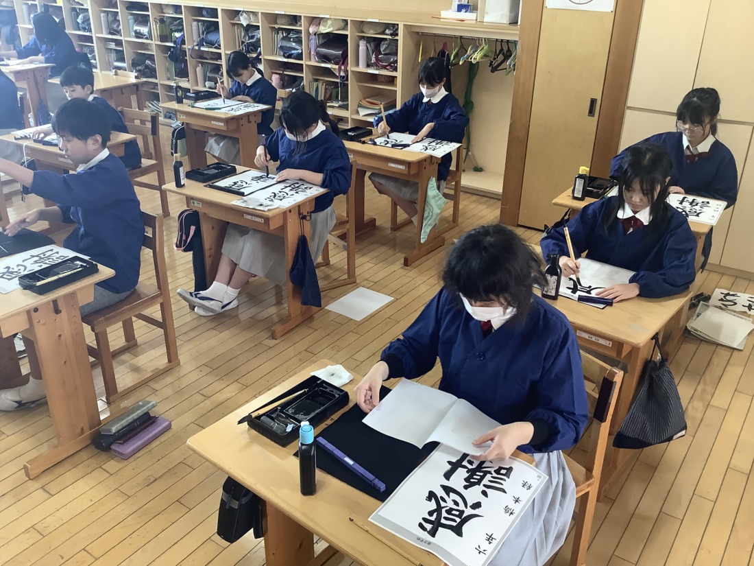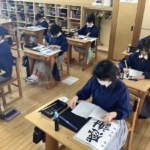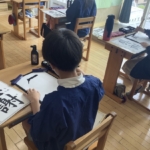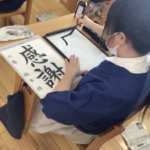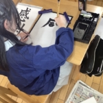 心落ち着かせて、「感謝」をかきました。画数が多く難しかったのですが、字のバランスに気をつけながら、お手本の「止め、はね、はらい」をしっかり見ながら書きます。これまで習ってきた始筆、終筆も上手にできていました。