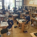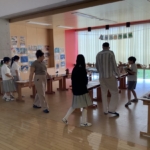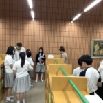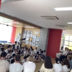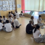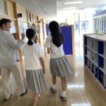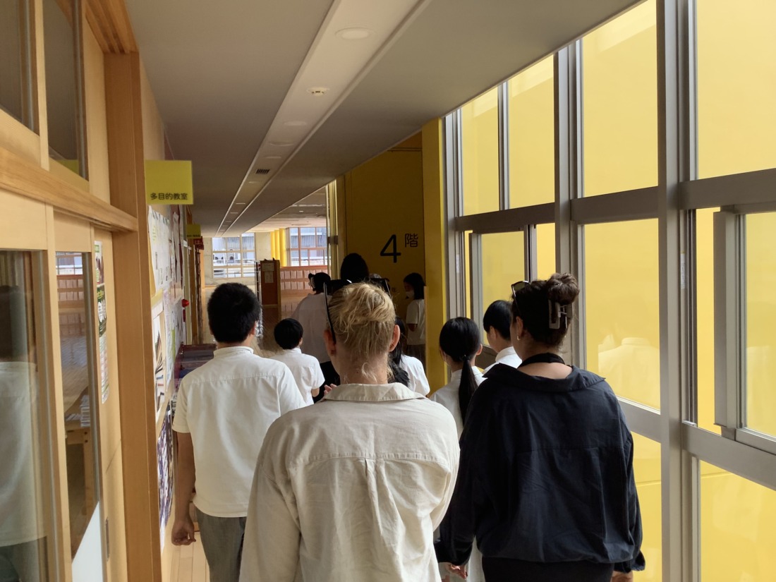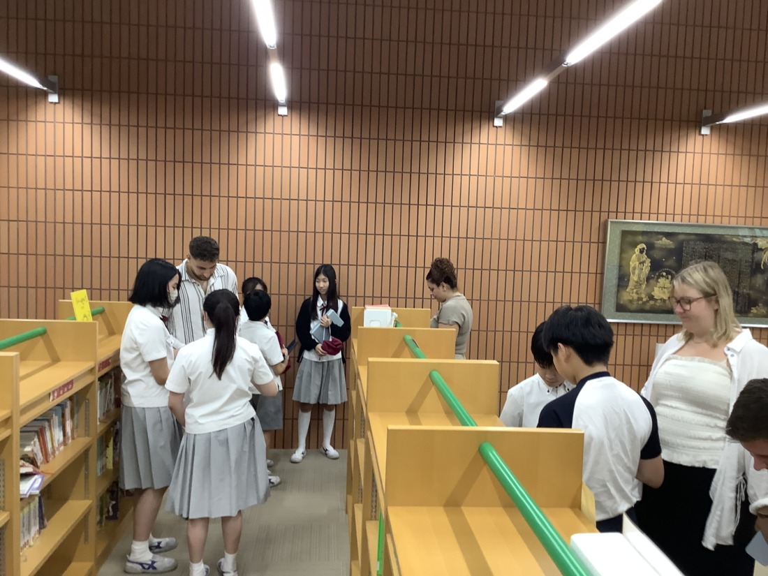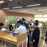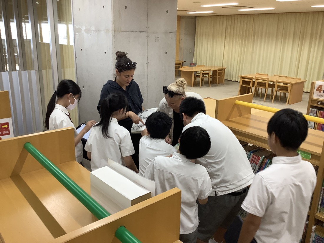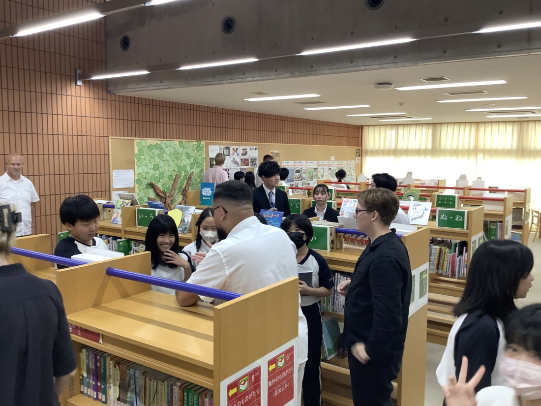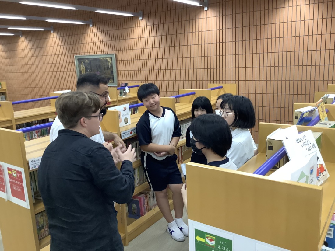 その後、グループに分かれタブレットを使ってプレゼンし、さらに交流を深めました。パワーアップには、それぞれのグループで学校案内をしました。運動場や図書室に行きました。図書室では、おすすめの本を持ってきて、自然とコミュニケーションをとっていました。