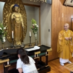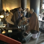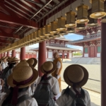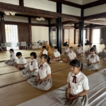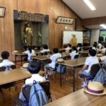 仏教校外学習で四天王寺に行きました。まず初めに、中心伽藍を見学させていただき、四天王寺の歴史や五重塔などの説明をしてもらいました。次に舎利出しを行いました。「舎利出し」とは、お釈迦様の遺骨である「舎利(しゃり)」を容器から取り出し、加護を得る儀式です。子どもたちは、お釈迦と直接的な縁を結び、仏の導きを授かりました。坐禅では、正しい姿勢で座り、呼吸を調え、心を集中させ取り組むことができました。最後には、十七条憲法の第一条、第二条の写経行いました。一文字ずつ気持ちを込めて書き、願い事もしっかりと書くことができました。