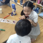 4年生の子どもたちは、未就学の子どもたちに対して、優しく丁寧に教えることができていました。