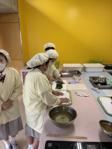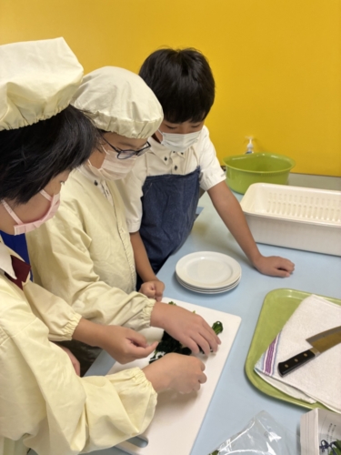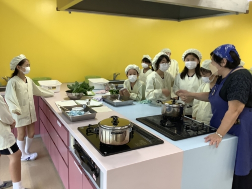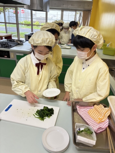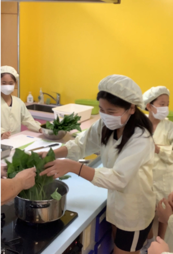 「青菜を茹でるとどうなるのだろう」というテーマで実習を進めます。