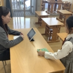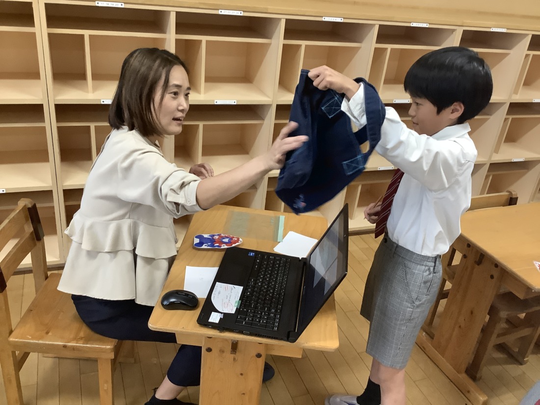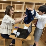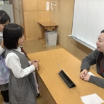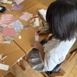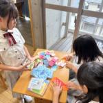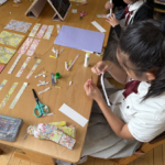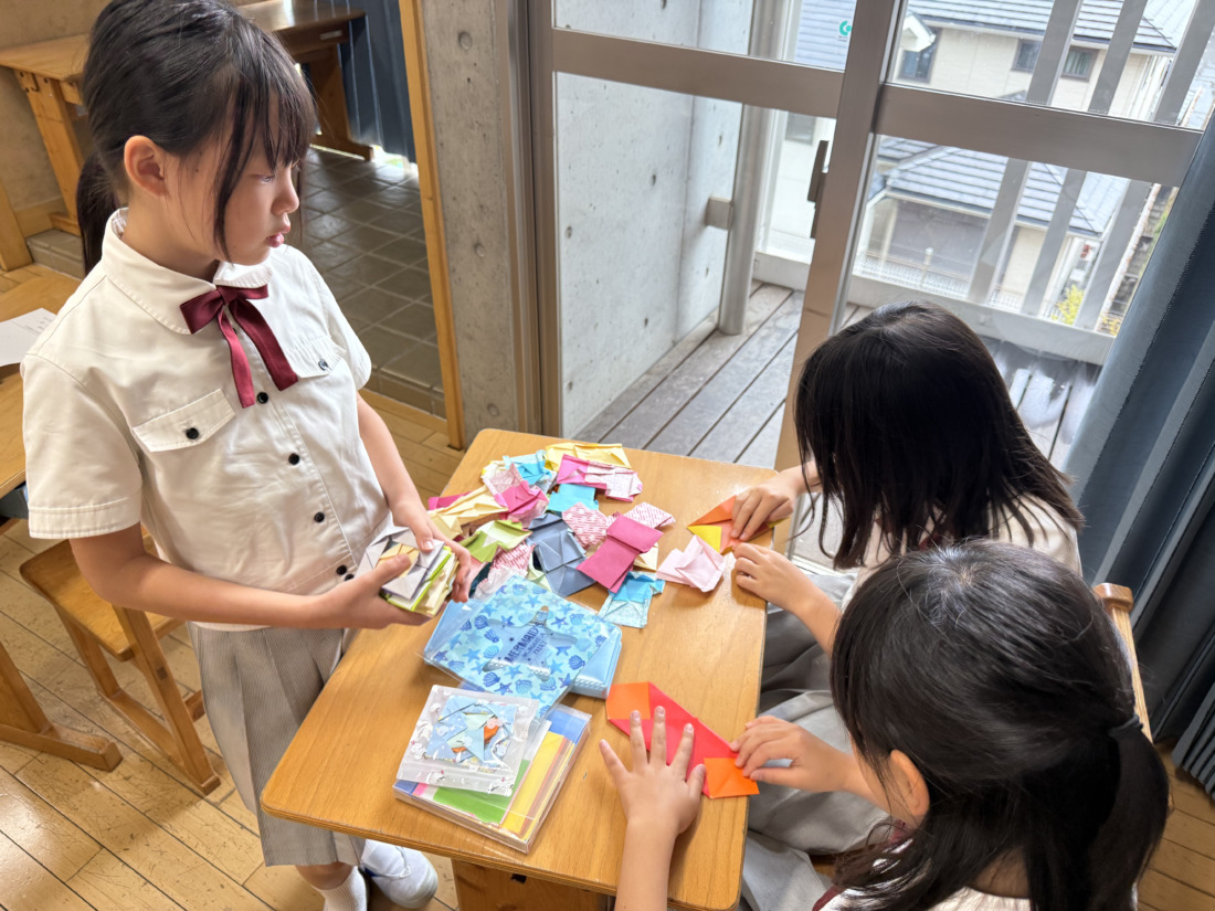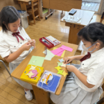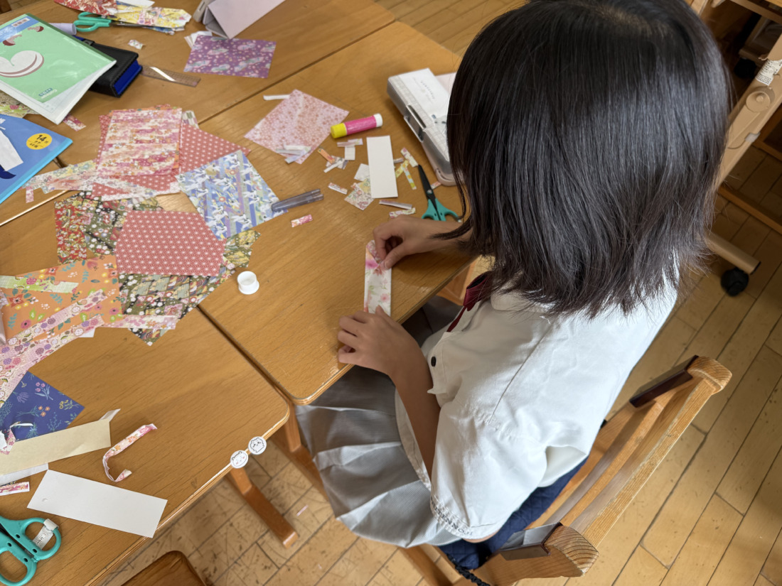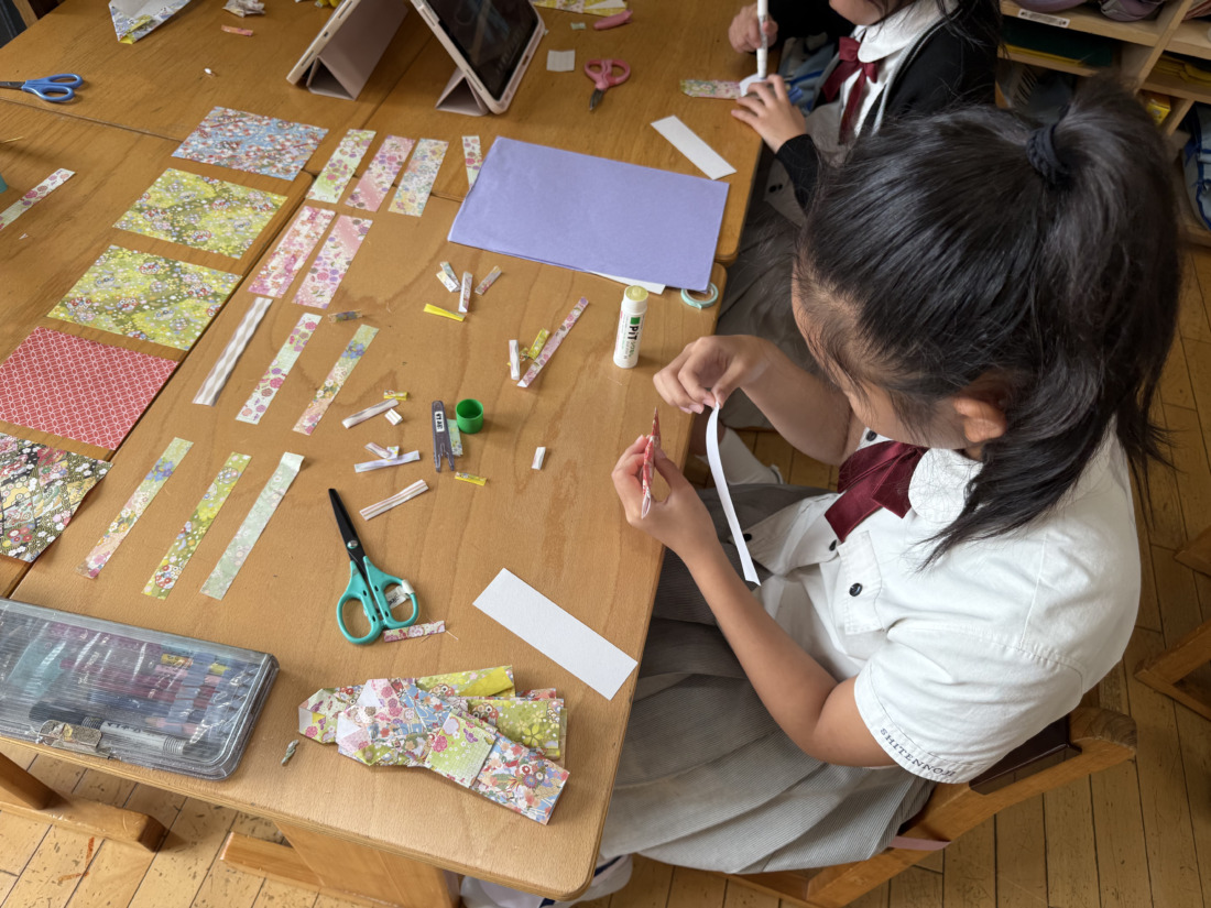 ミリラニウカとの交流では、日本の伝統的な遊びである「折り紙」を教えます。そのために英語で説明しながら折れるように各グループで準備を進めています。また、お土産に着物のしおりも作りました。大阪・関西万博の公式キャラクターであるミャクミャクもプレゼントしたいと休み時間も準備をしている子どもたちもいます。