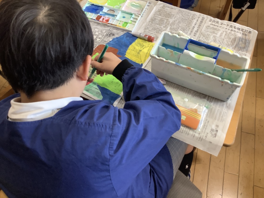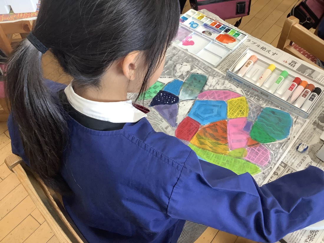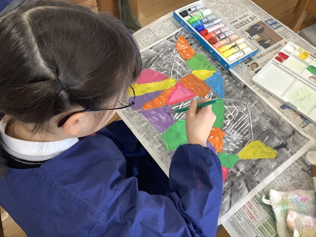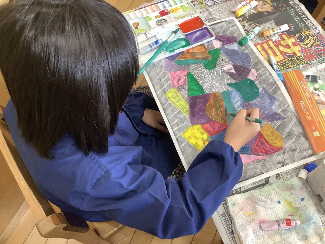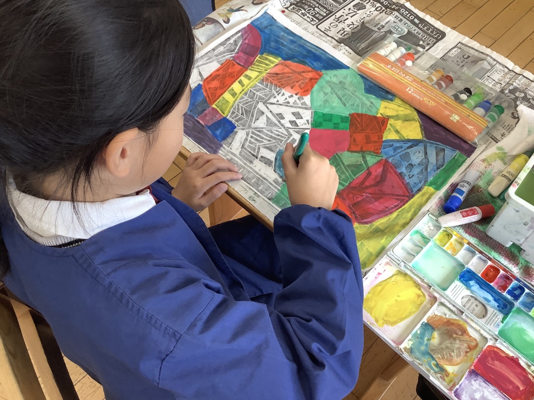 彫刻刀の使い方にも慣れ、慎重に彫り進め、丁寧に彫り終えることができました。色々な模様を彫った後、刷りました。「おー!綺麗な模様ができた!」「いい感じ!」「面白い模様になってる!」など喜びの声があがりました。最後に色をつけていきます。もうすぐ完成!さぁ、どんな作品になるのか、楽しみです!