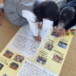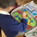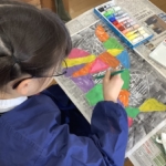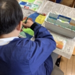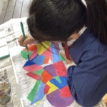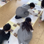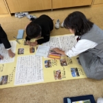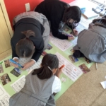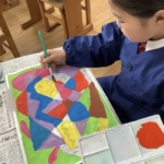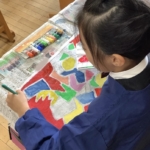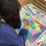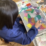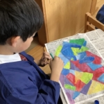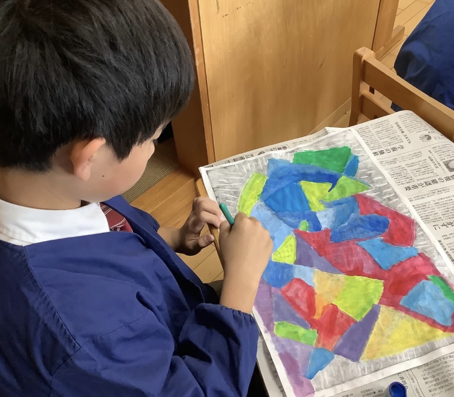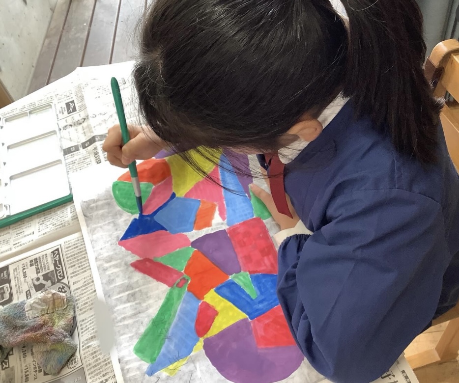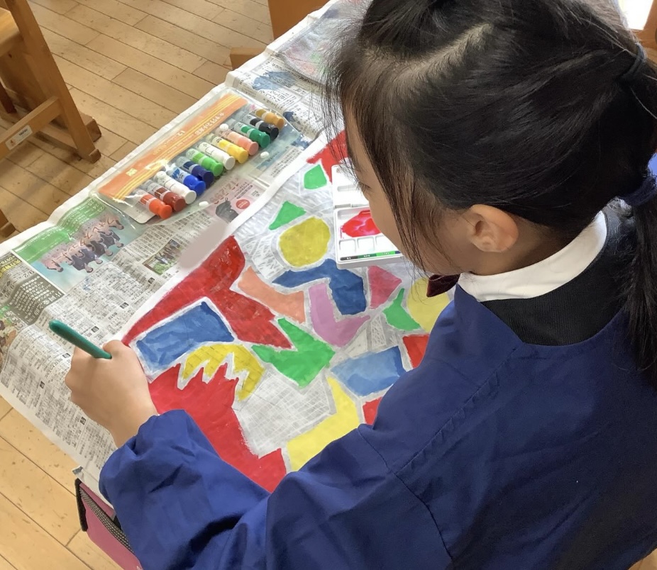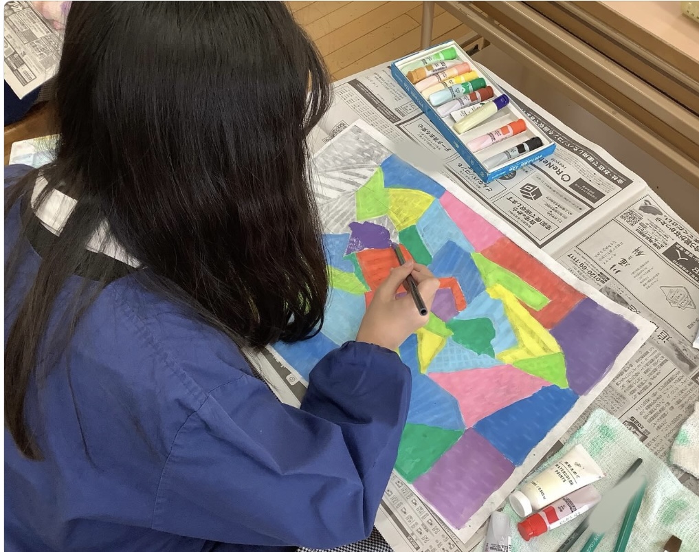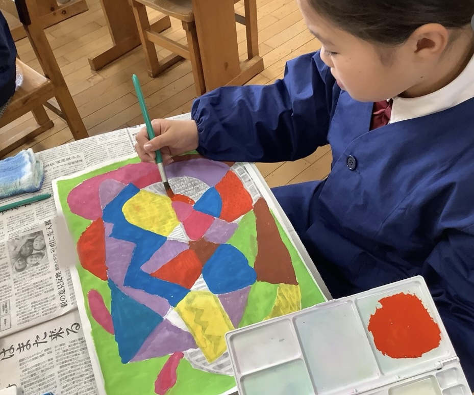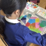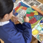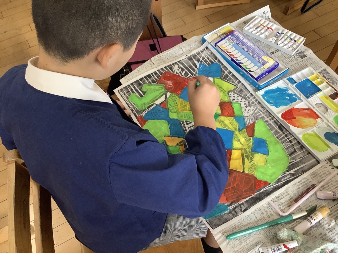 彫刻刀の使い方にも慣れ、慎重に彫り進め、丁寧に彫り終えることができました。色々な模様を彫った後、刷りました。「おー!綺麗な模様ができた!」「いい感じ!」「面白い模様になってる!」など喜びの声があがりました。最後に色をつけていきます。もうすぐ完成!さぁ、どんな作品になるのか、楽しみです!