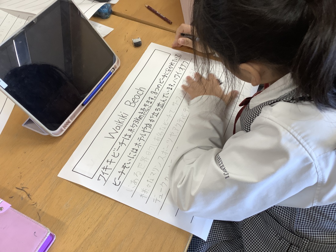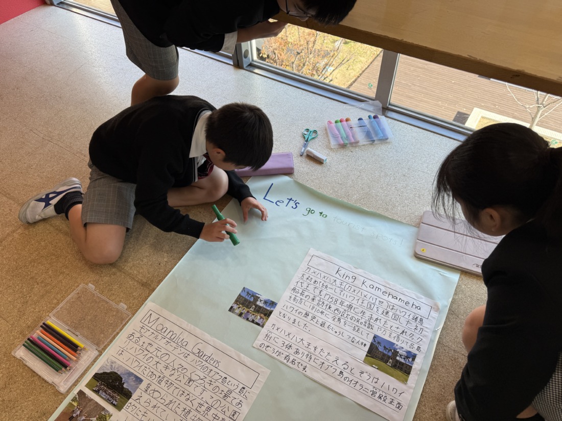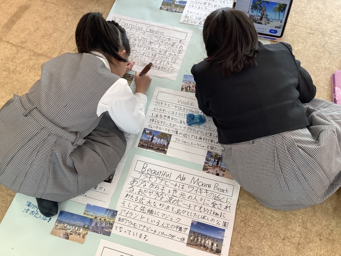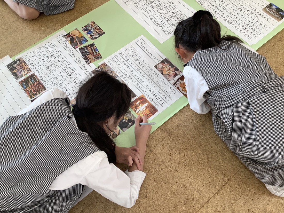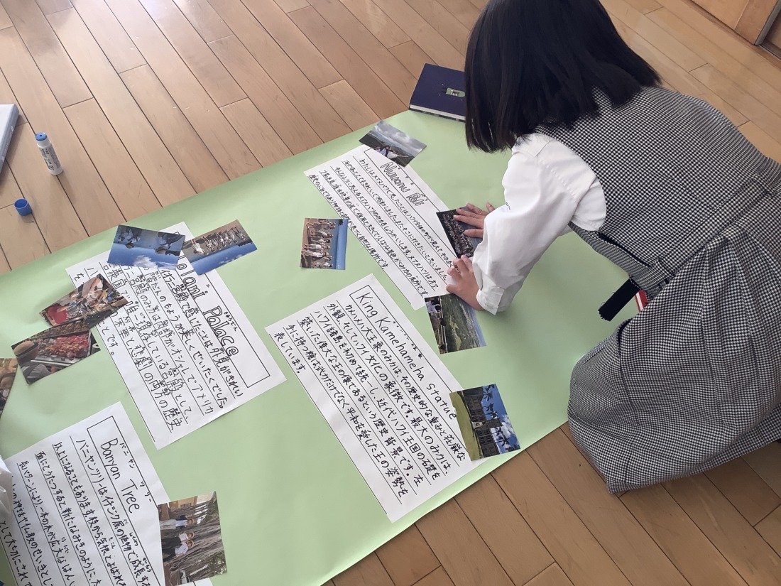 海外研修に行って学んできたことをまとめる学習をしています。来年度、海外研修に行く3年生にハワイのことを教えてあげたい!という声が挙がりました。ハワイの基本的な知識や実際に研修でどんな活動をしてきたのか、伝えたいことはたくさんあるようです。3年生が来年の海外研修を楽しみ!と思えるよう、グループで協力して工夫してまとめています。どんな発表になるのか、とても楽しみです。