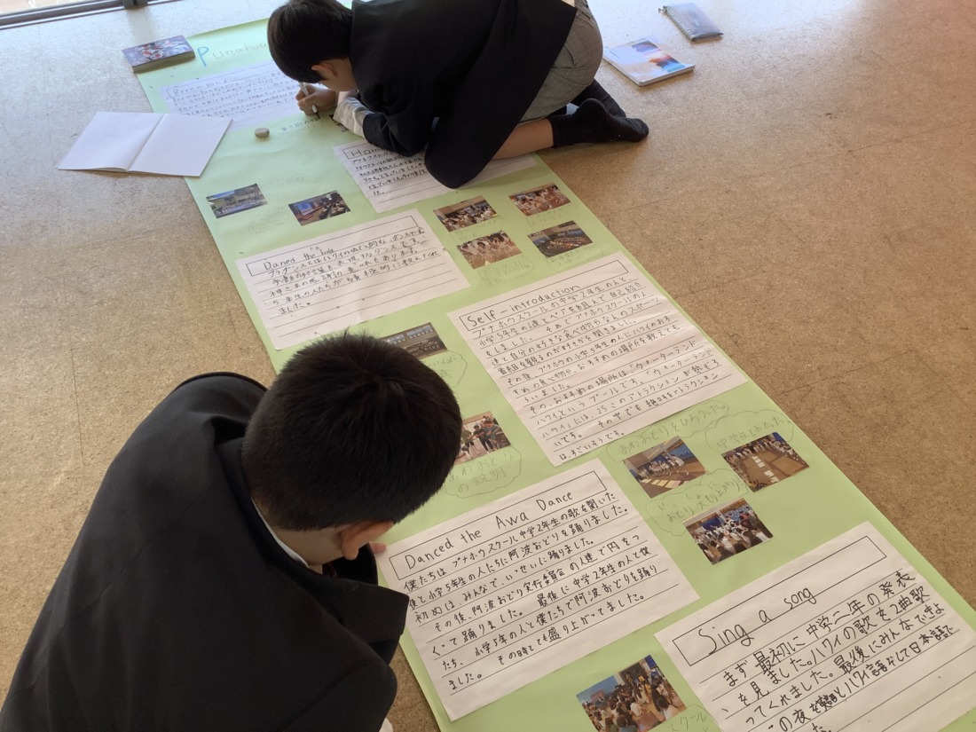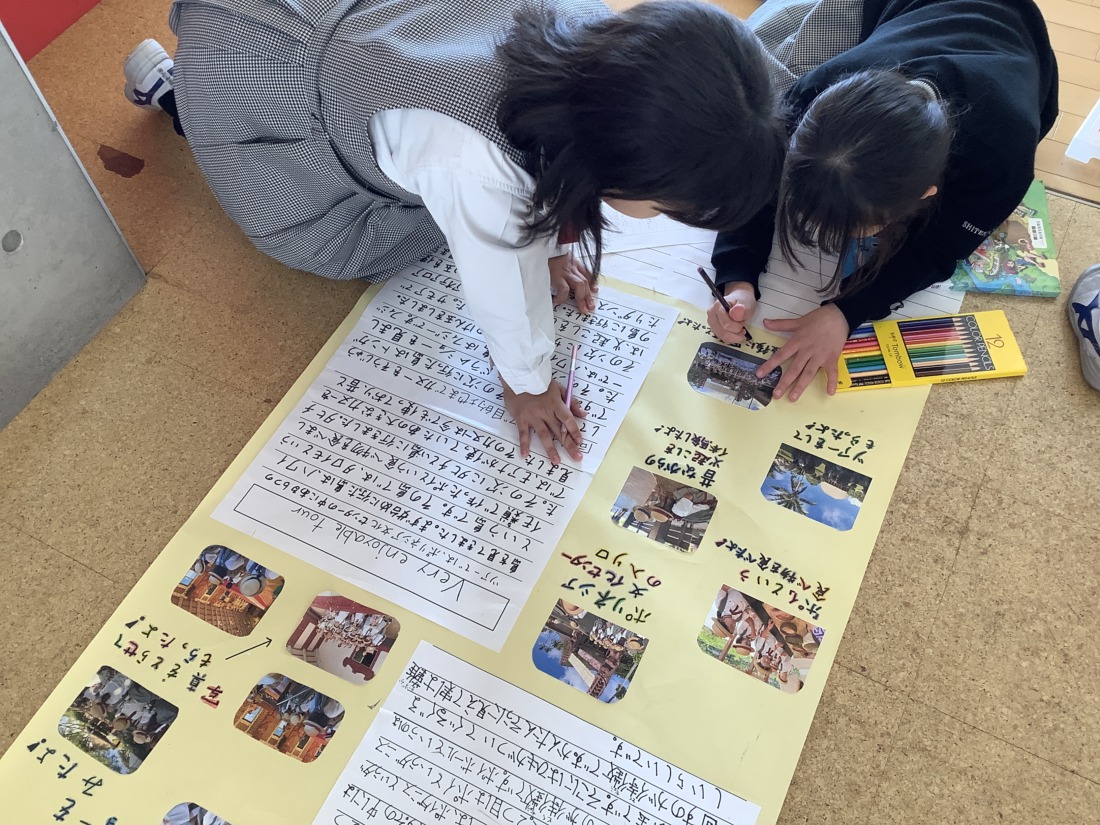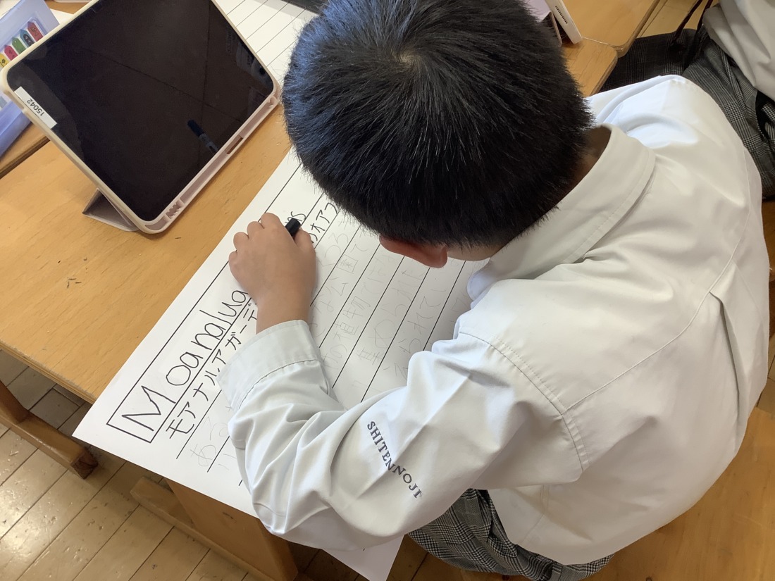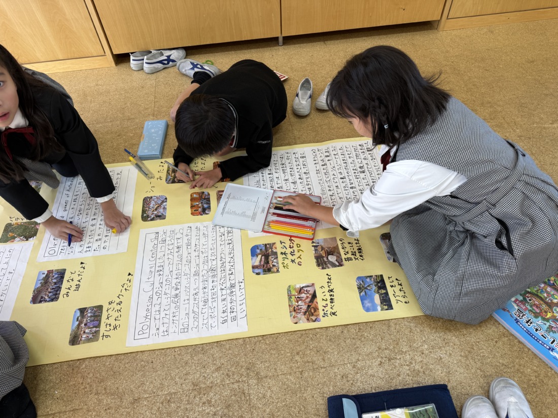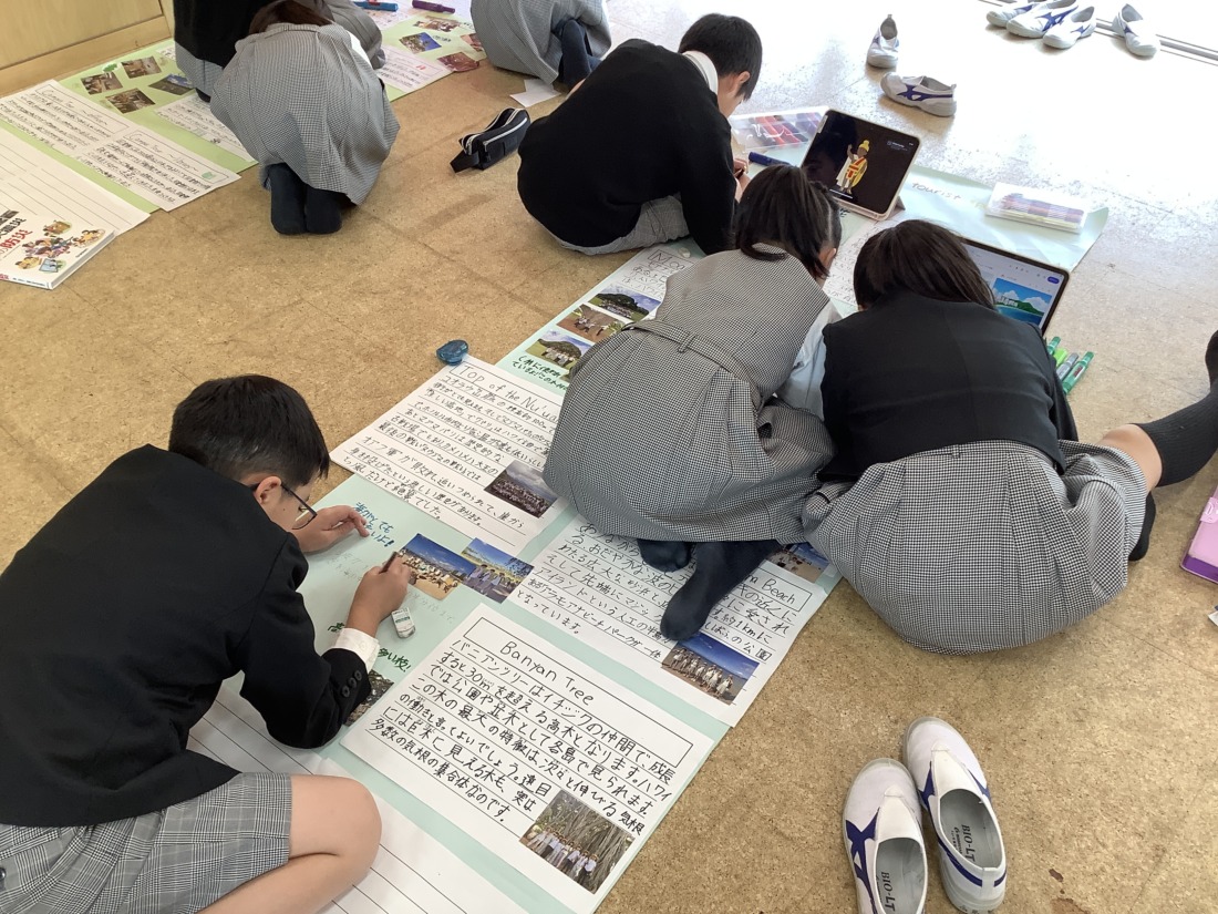 海外研修に行って学んできたことをまとめる学習をしています。来年度、海外研修に行く3年生にハワイのことを教えてあげたい!という声が挙がりました。ハワイの基本的な知識や実際に研修でどんな活動をしてきたのか、伝えたいことはたくさんあるようです。3年生が来年の海外研修を楽しみ!と思えるよう、グループで協力して工夫してまとめています。どんな発表になるのか、とても楽しみです。
