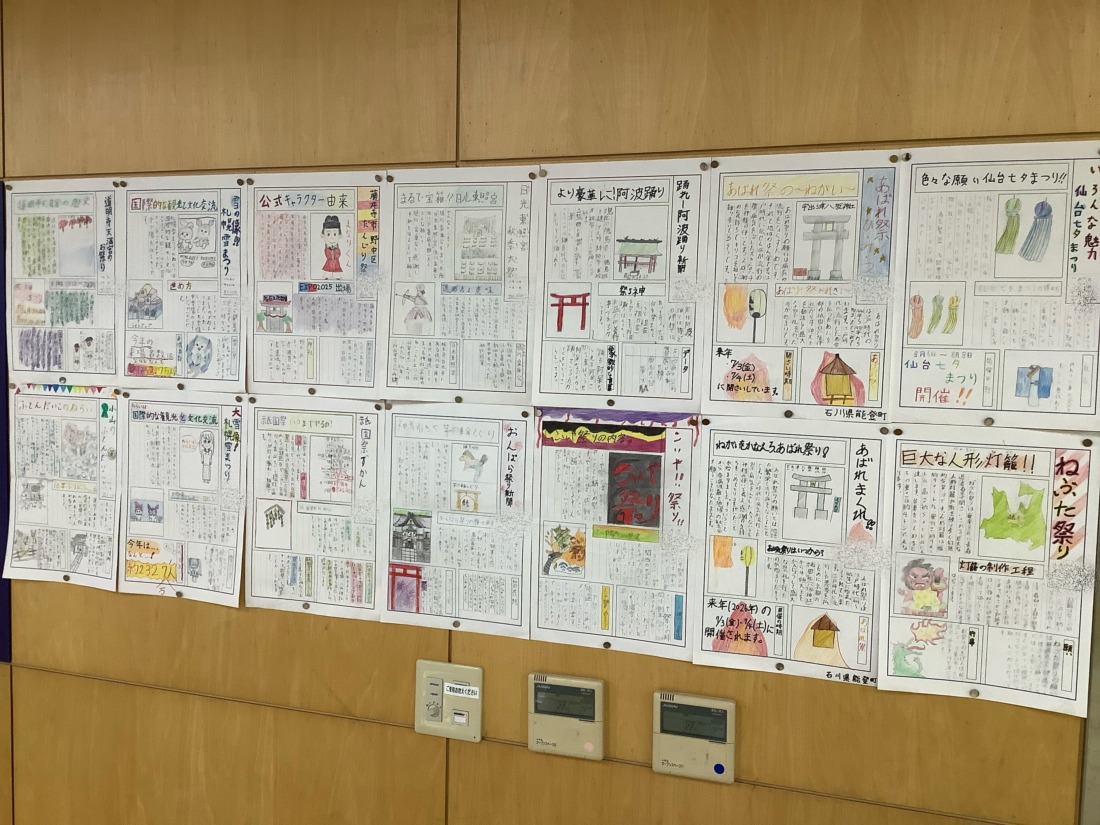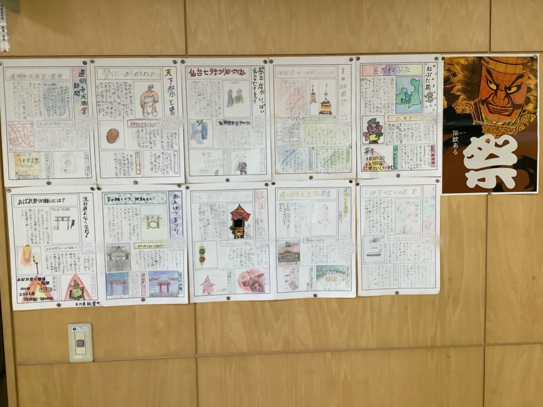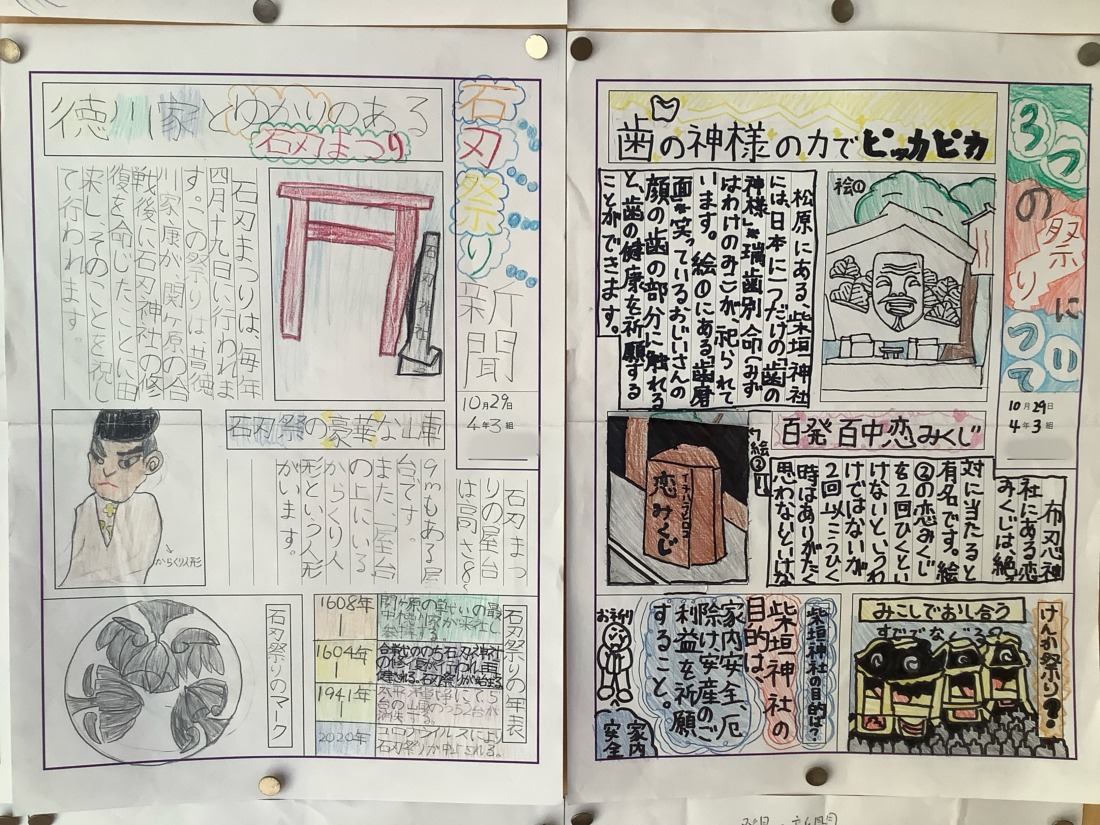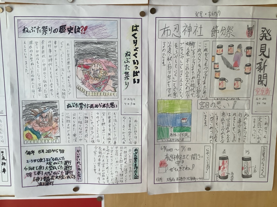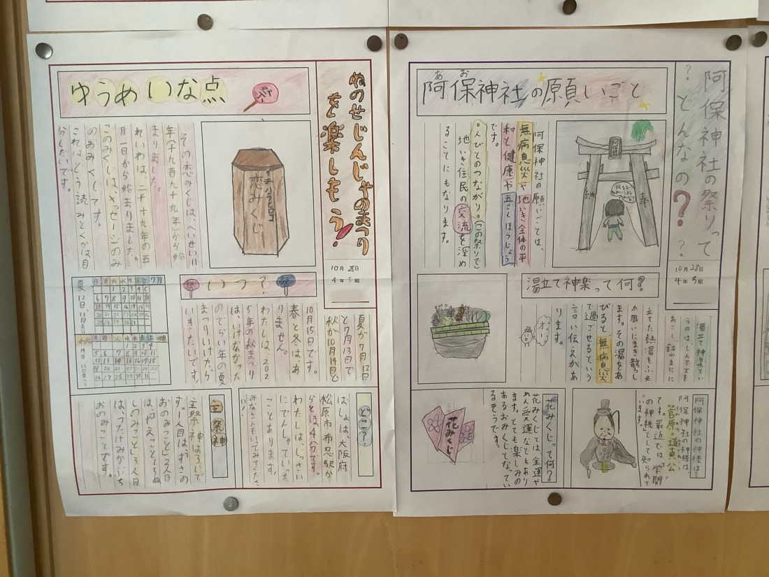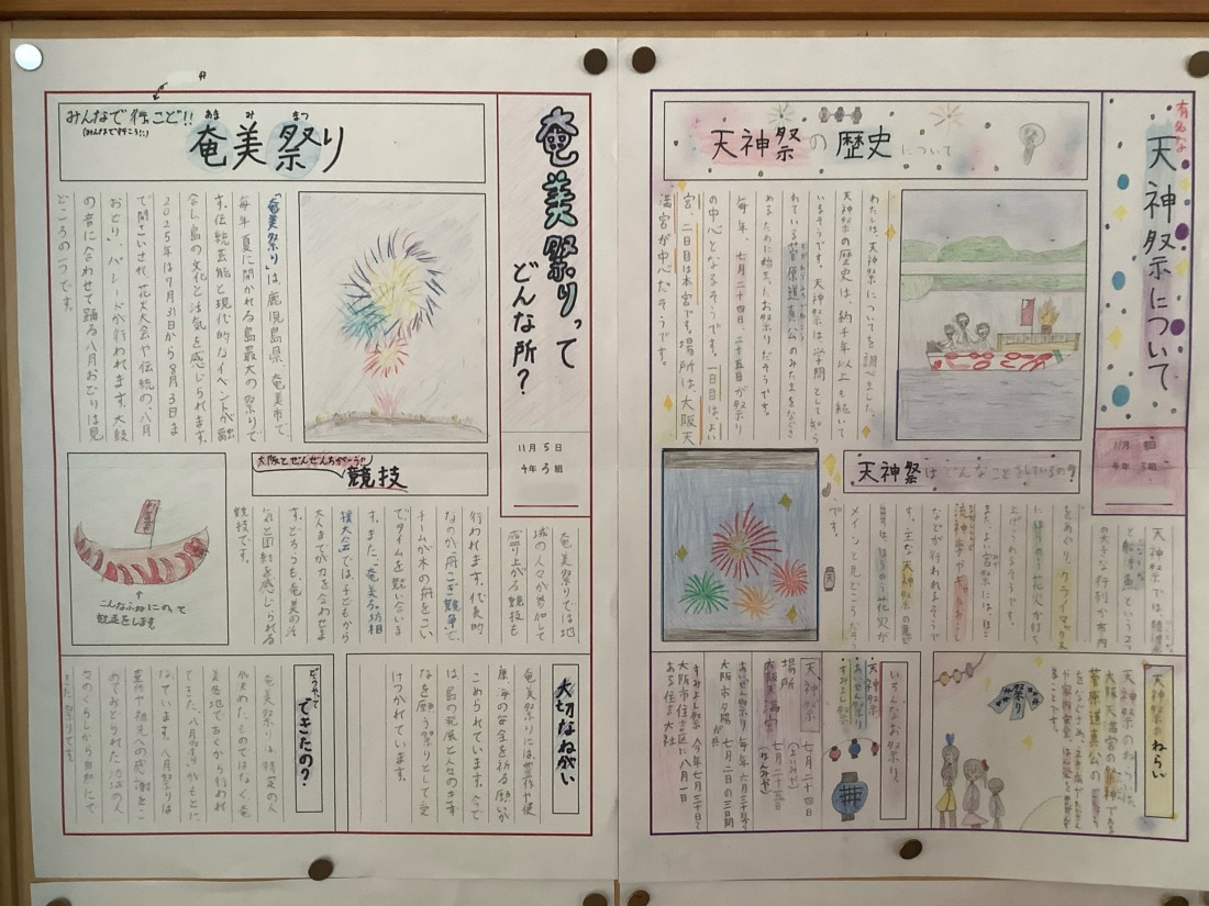 社会科では、「受け継がれてきた祭り」として日本三大祭りである「天神祭」について学習しました。私たちが楽しみにしている祭りは、それぞれ「願い」があることを知りました。天神祭では、昔、大阪で疫病が流行ったり洪水に苦しんだりした歴史から、人々が健康で穏やかに平和に過ごせるようという願いが込められていました。そこで、いつも楽しませてもらっている近所の祭りや有名な祭りについて調べました。