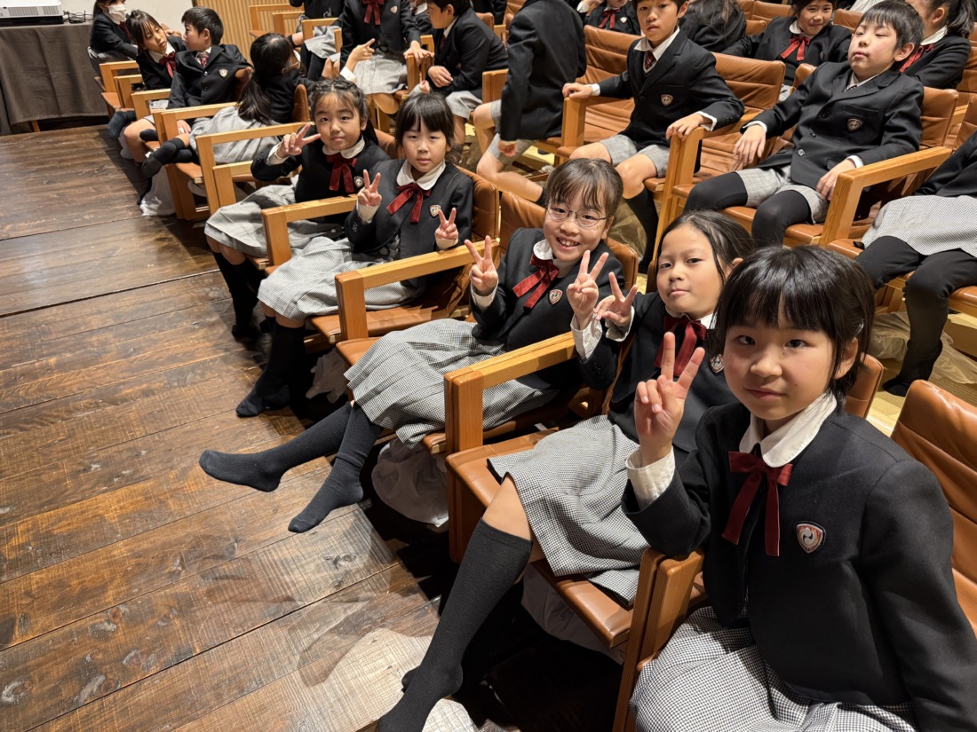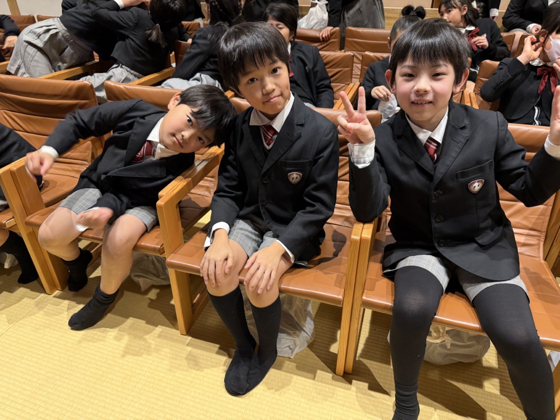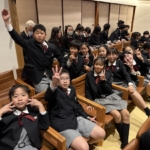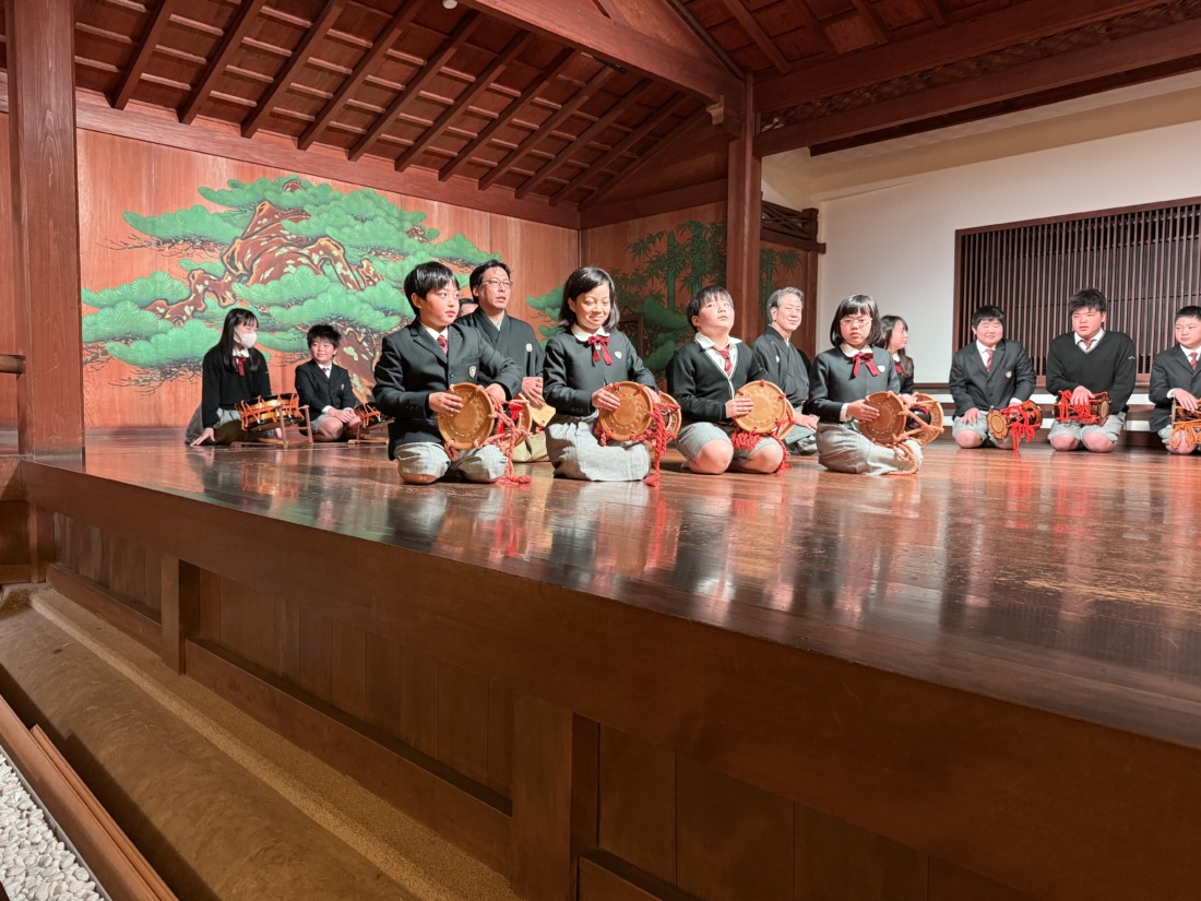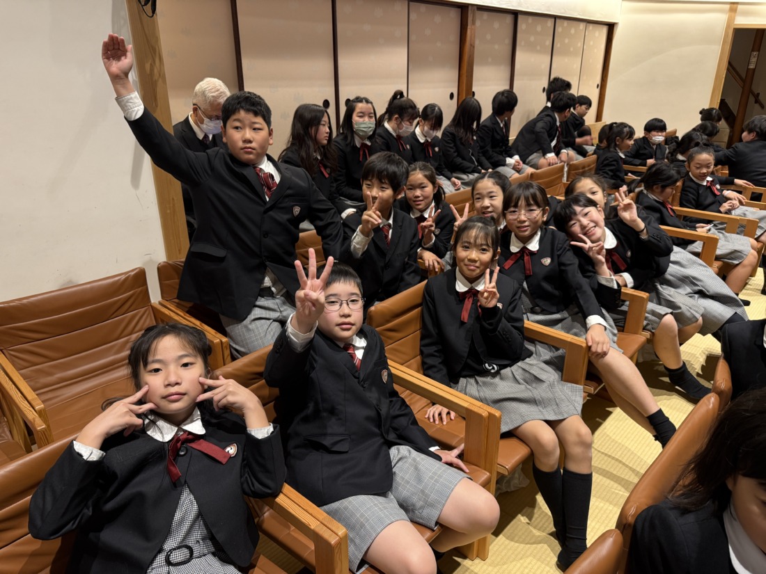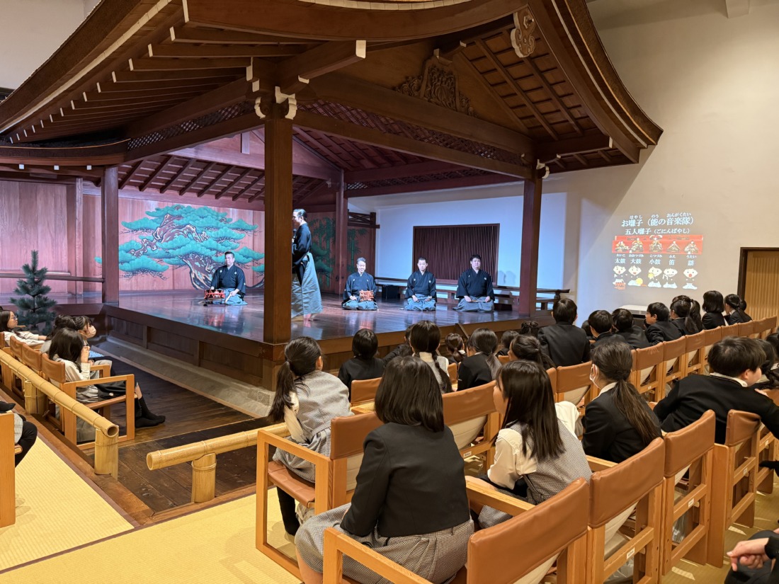 4・5・6年生は、能楽鑑賞に出かけました。場所は山本能楽堂です。建物の中に入ると、とても雰囲気のある舞台。囲むような形で鑑賞します。まずは、能の歴史のお話がありました。700年前に生まれた能という芸能が現代に受け継がれています。そして、数名の児童による「お囃子」体験。小鼓や大鼓、太鼓を叩かせていただきました。見ている児童も声を出して、手拍子で合わせてみました。歴史を感じる何か心地のよい音がしました。いよいよ能楽の鑑賞です。題名は「土蜘蛛」。とっても怖い鬼が出てきました。近くで見ているので、すごい迫力でした。何となくストーリーもわかりました。みんな引き込まれました。最後はいろいろな質問をして能楽をより知ることができました。山本能楽堂の皆様、貴重な体験をありがとうございました。