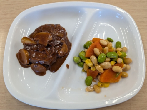 「デミグラスソースハンバーグ」は、ソースにハヤシフレークを使っています。ハンバーグは鶏肉と豚肉の合挽き肉を使っています。