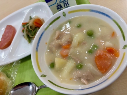 「クリームシチュー」は、お野菜もたっぷりはいっています。とろりとしたスープで体も心も温まります。