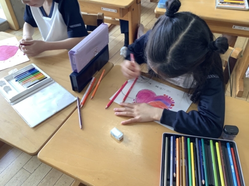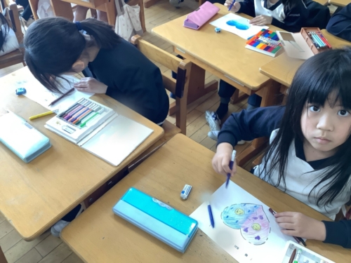 宗教の時間に「どんなかんじかなあ」のお話を聞いて、感想を絵で表現しました。