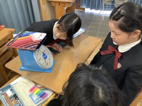 どちらが重いのかてんびんを使って比べたり、どれくらいの重さがあるのかはかりを使ってはかりました。