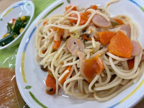 「和風スパゲティ」は、玉ねぎ・にんじん・しめじ・白ねぎ・ウインナーなど、たくさんの具材が入っています。