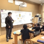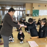 四天王寺からは、最近のみんなの学校生活を紹介しました。なわとびを頑張っていること。カルタ大会があったこと。おもしろい紙相撲のこと。上手に給食着がたためること。