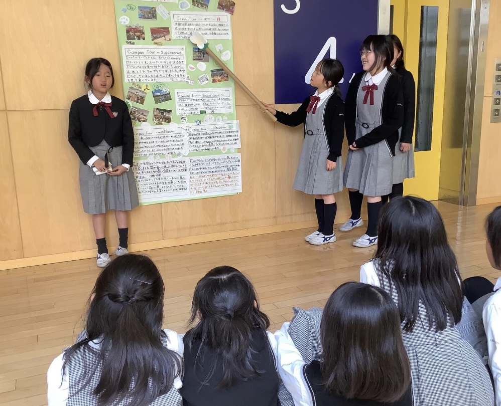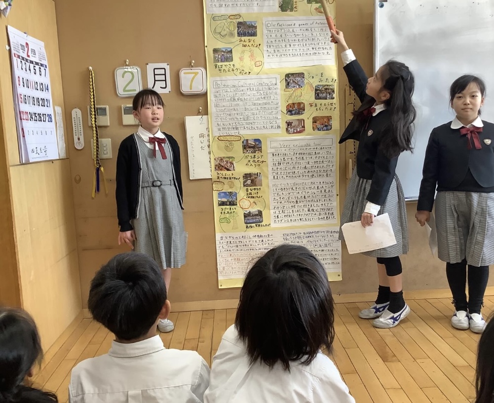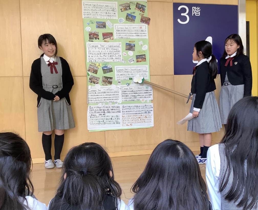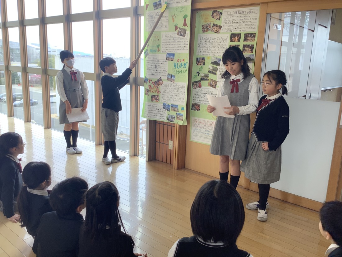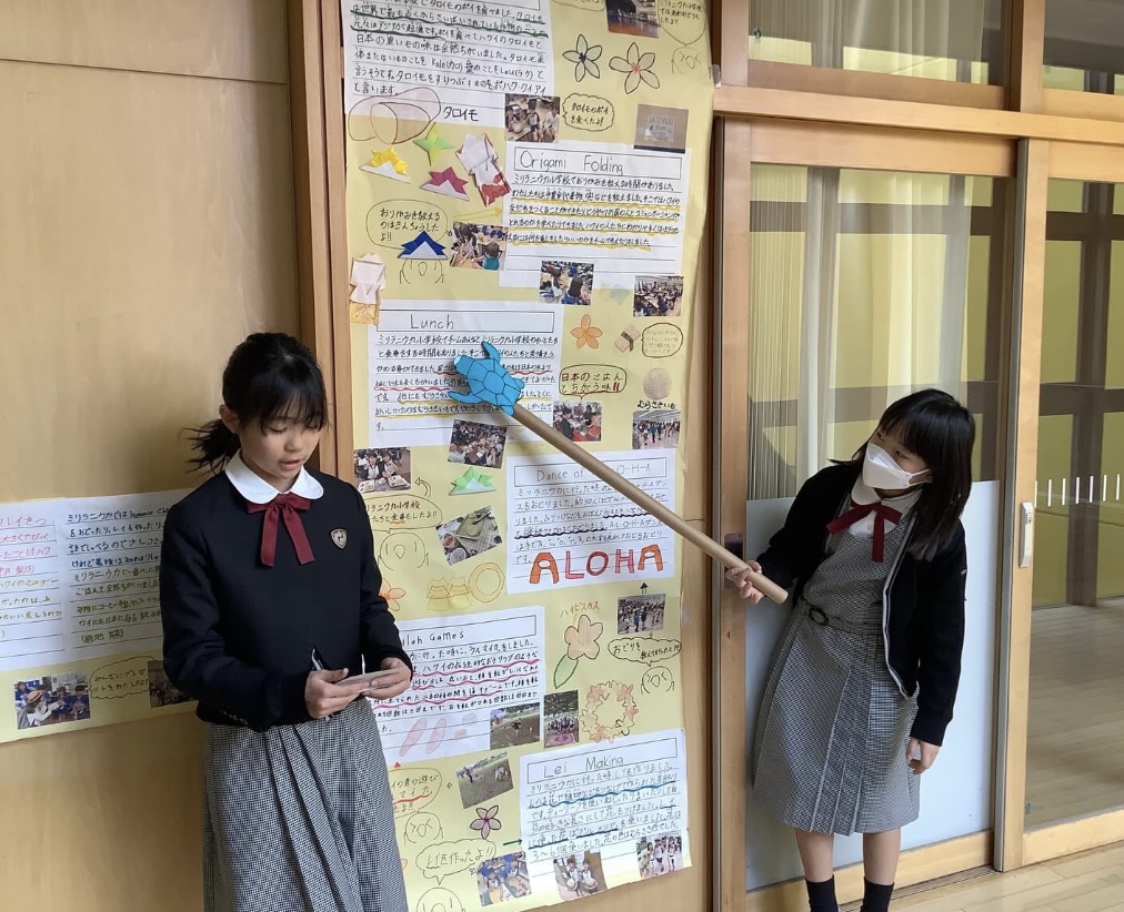 今日は、海外研修(ハワイ)についてまとめたことを来年度海外研修に行く3年生に発表しました。ハワイの魅力を伝えるためにグループで工夫してまとめたり何度も練習したりしました。実際に行って体験したことや感じたこともしっかり伝えることができました。