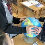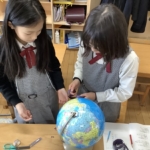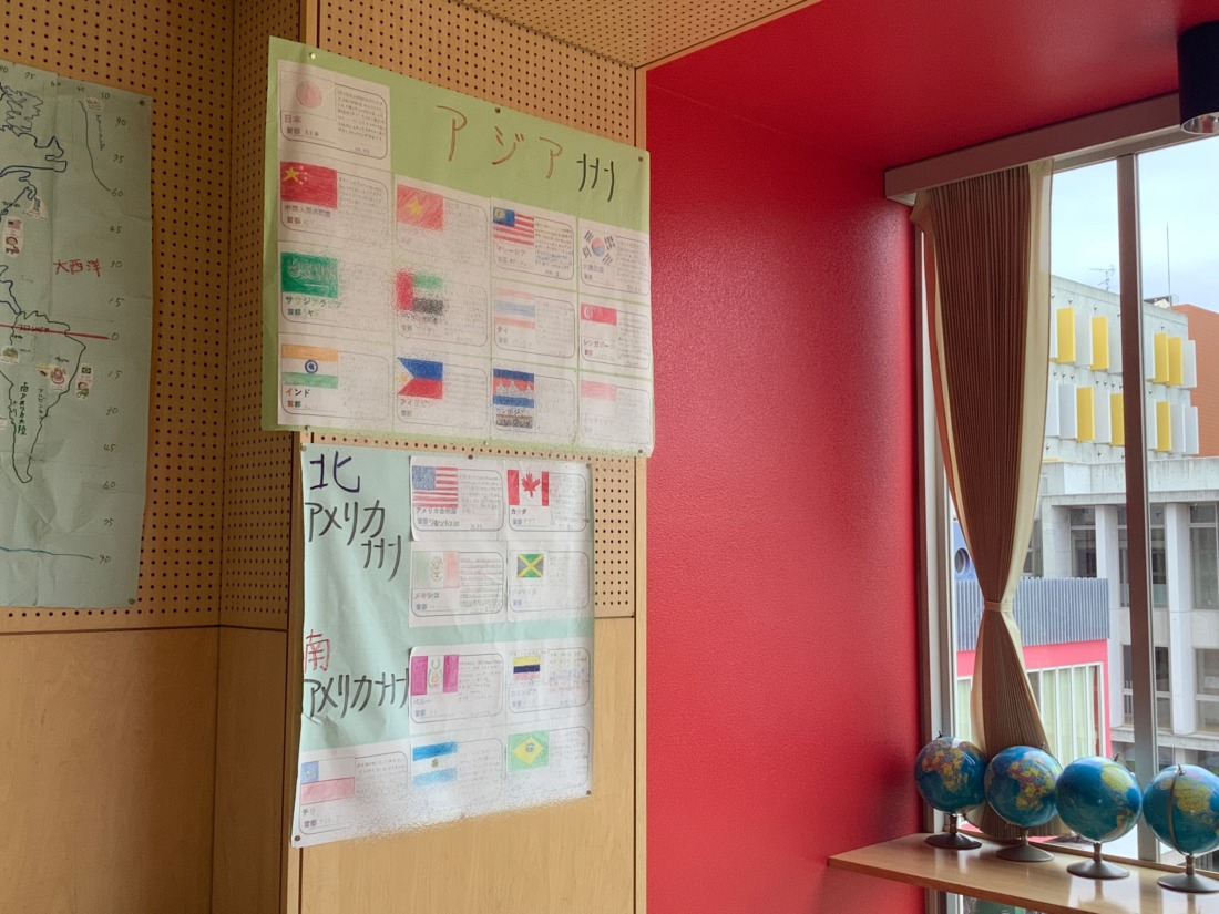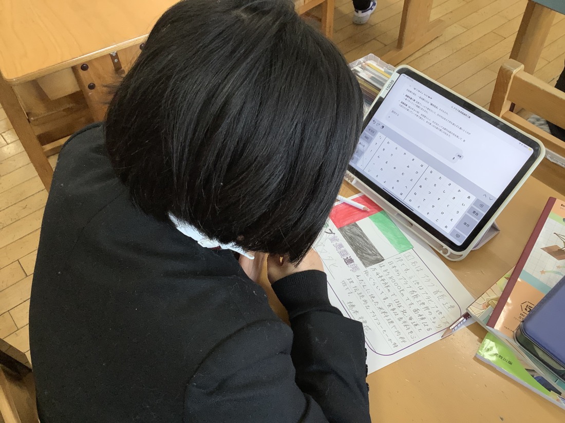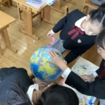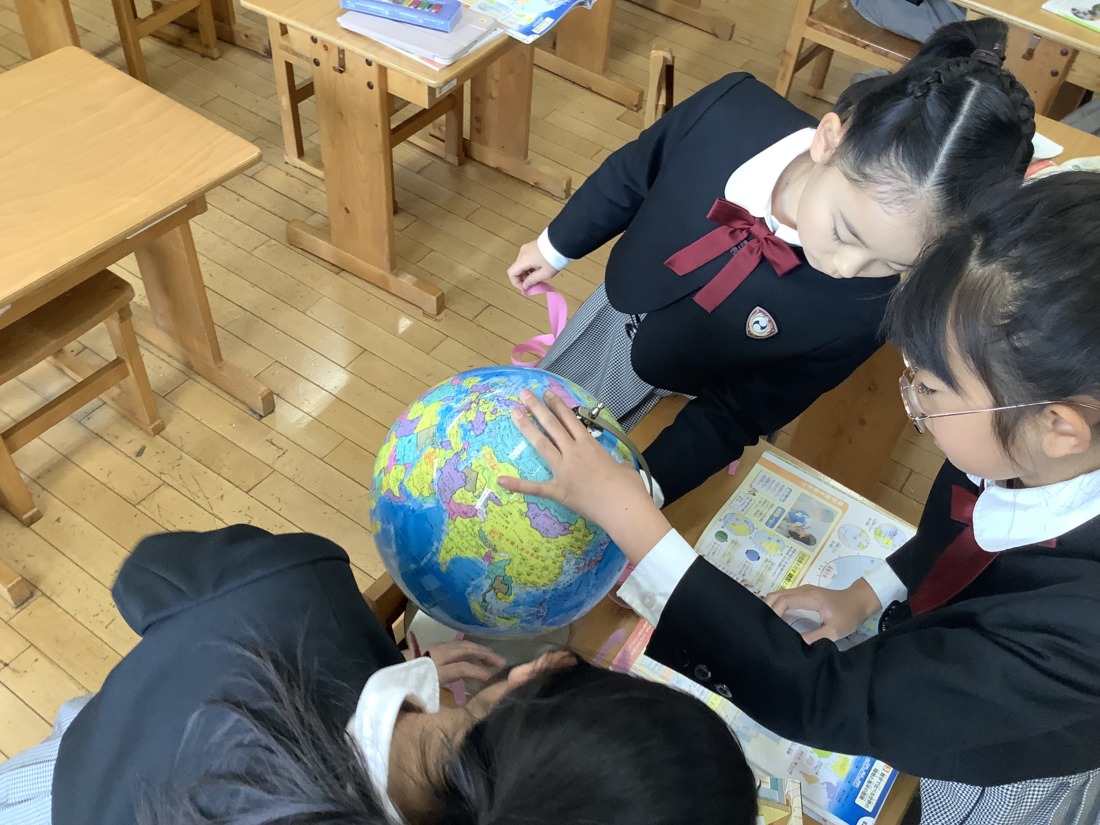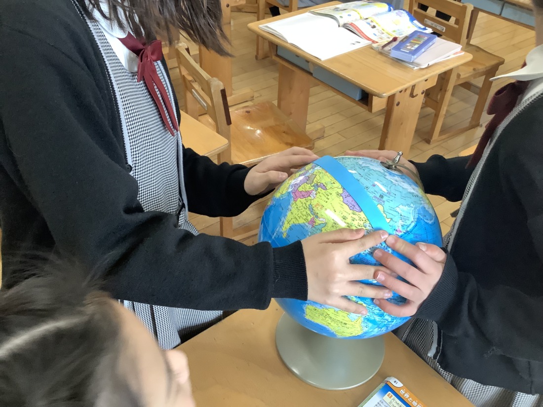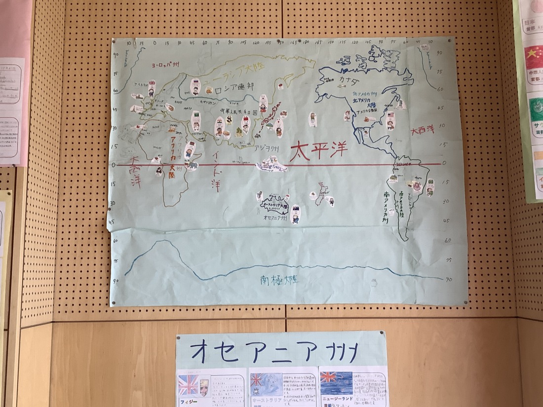 地図帳を広げた時に縦や横に引いてある線、経線と緯線の復習をしました。一人一人が一つの国を担当して、国の特徴や文化などを詳しく調べ、まとめました。また、経線と緯線に注目しながら世界地図をみんなで協力して完成することができました。