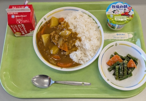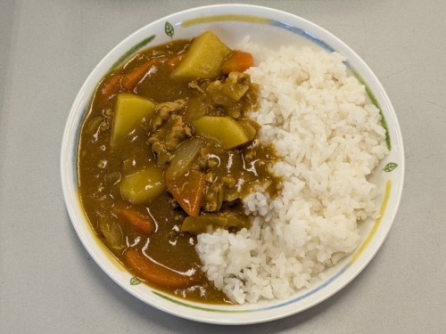 「ポークカレーライス」は豚肉の他、人参・玉ねぎ・じゃがいもの定番の野菜が入っています。