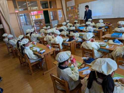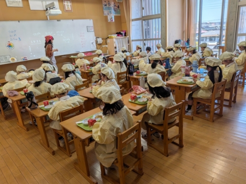 1年生の給食が始まりました。6年生がお手伝いに1年教室へ行っています。