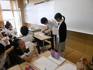ランダムに指名された生徒の解答を電子黒板に映し出し、生徒自ら解説を行いました。
